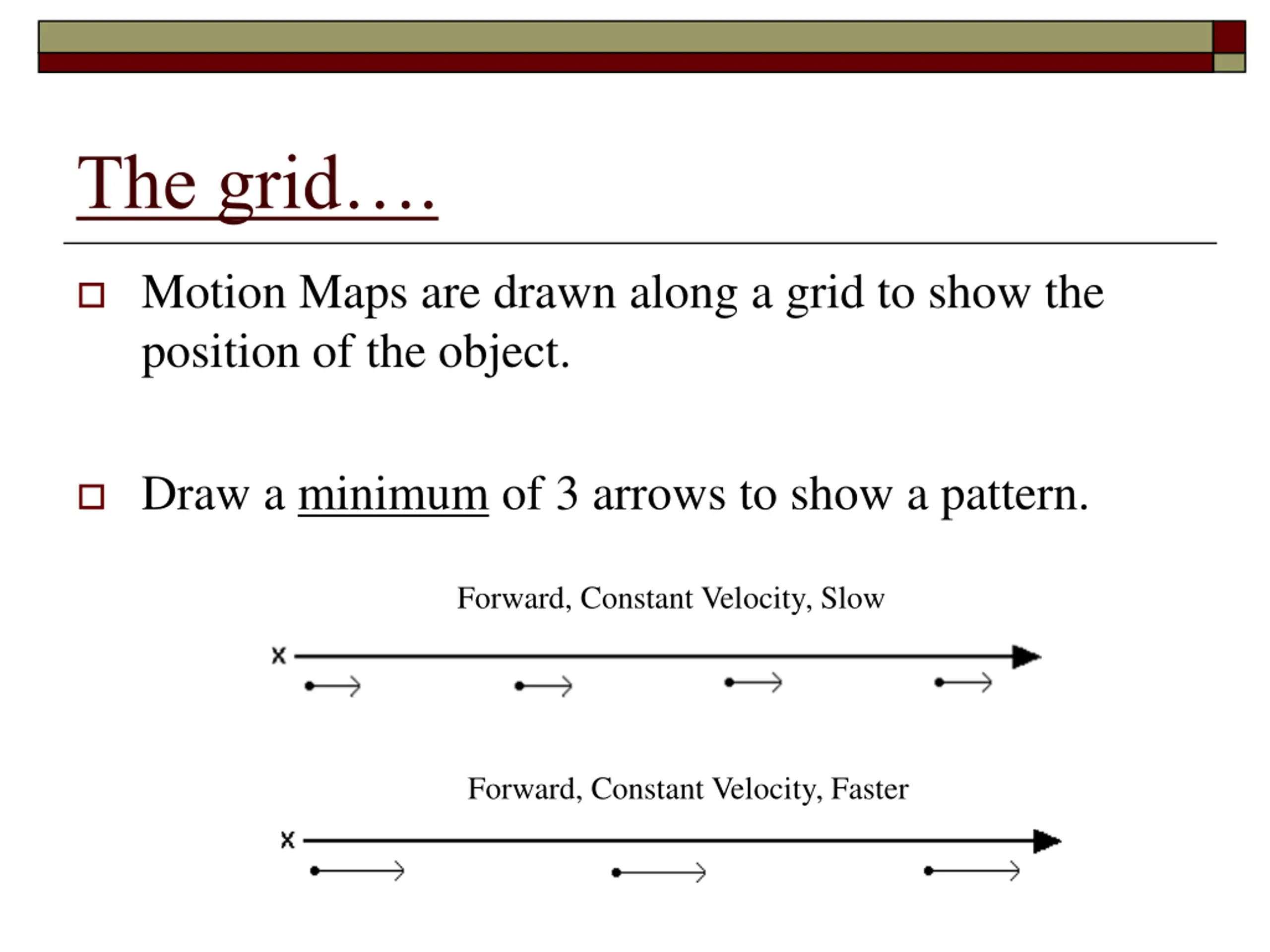 The grid. Motion Maps are drawn along a grid to show the position of the object. Draw a minimum of 3 arrows to show a pattern. Forward, Constant Velocity, Slow Forward, Constant Velocity, Faster