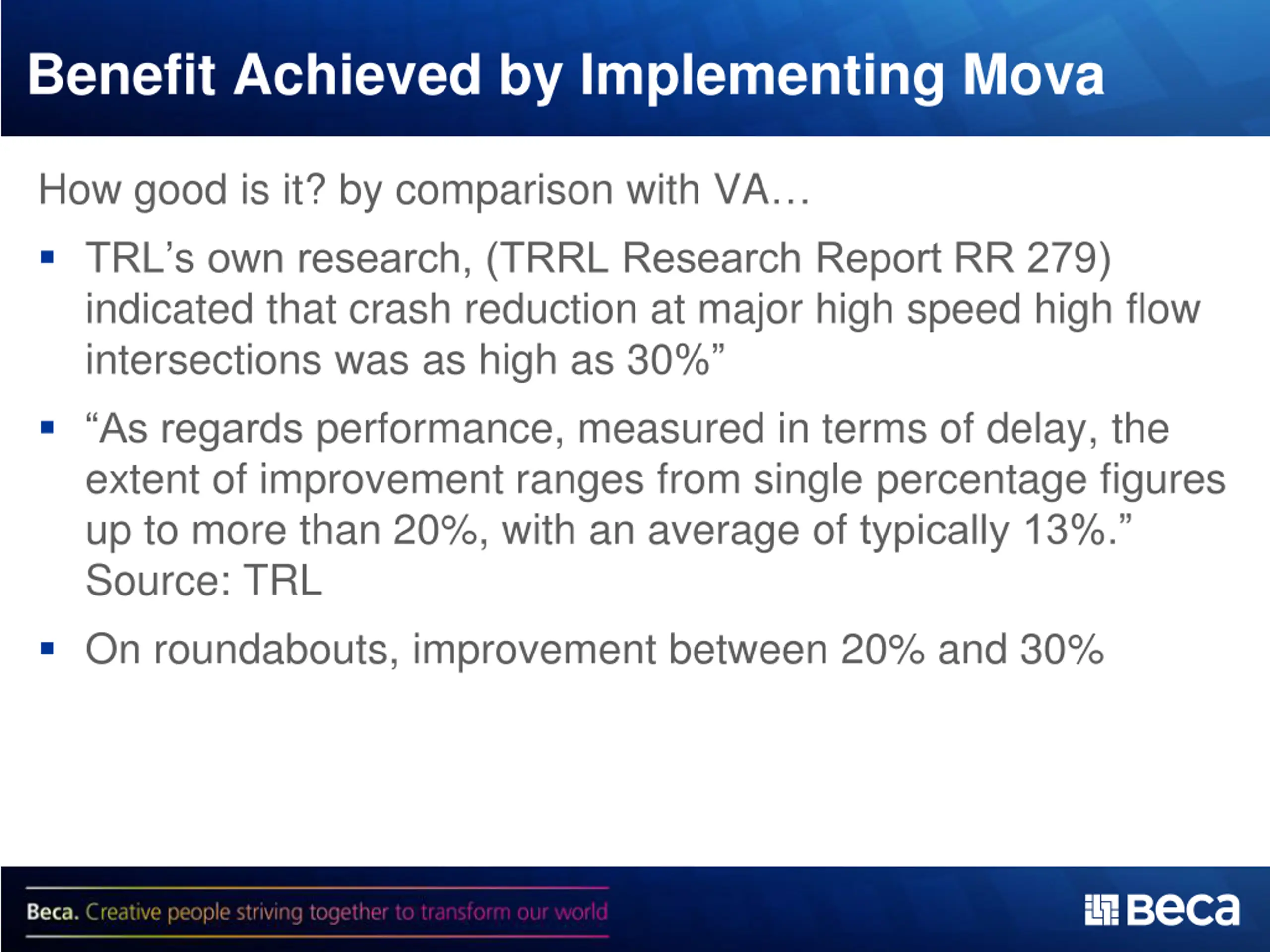 Benefit Achieved by Implementing Mova How good is it? by comparison with VA TRL s own research, (TRRL Research Report RR 279) indicated that crash reduction at major high speed high flow intersections was as high as 30% As regards performance, measured in terms of delay, the extent of improvement ranges from single percentage figures up to more than 20%, with an average of typically 13%. Source: TRL On roundabouts, improvement between 20% and 30%