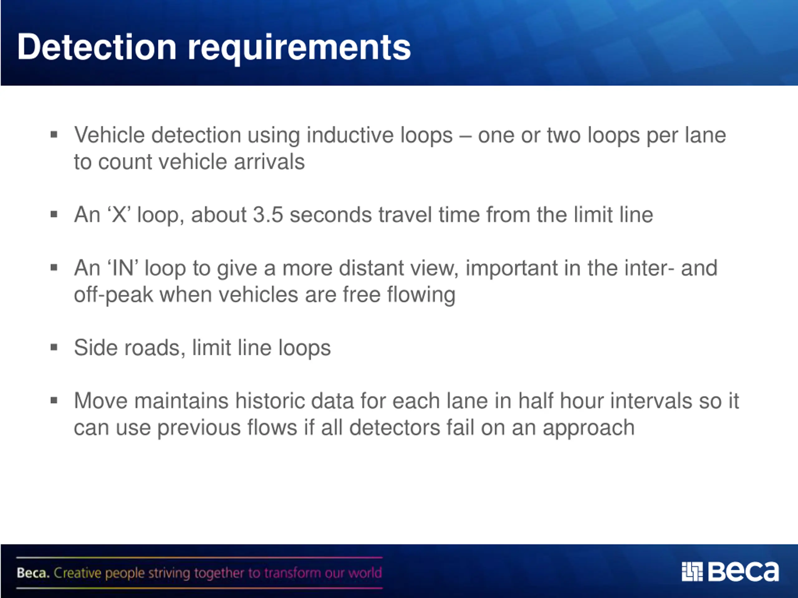 Detection requirements Vehicle detection using inductive loops one or two loops per lane to count vehicle arrivals An X loop, about 3.5 seconds travel time from the limit line An IN loop to give a more distant view, important in the inter- and off-peak when vehicles are free flowing Side roads, limit line loops Move maintains historic data for each lane in half hour intervals so it can use previous flows if all detectors fail on an approach