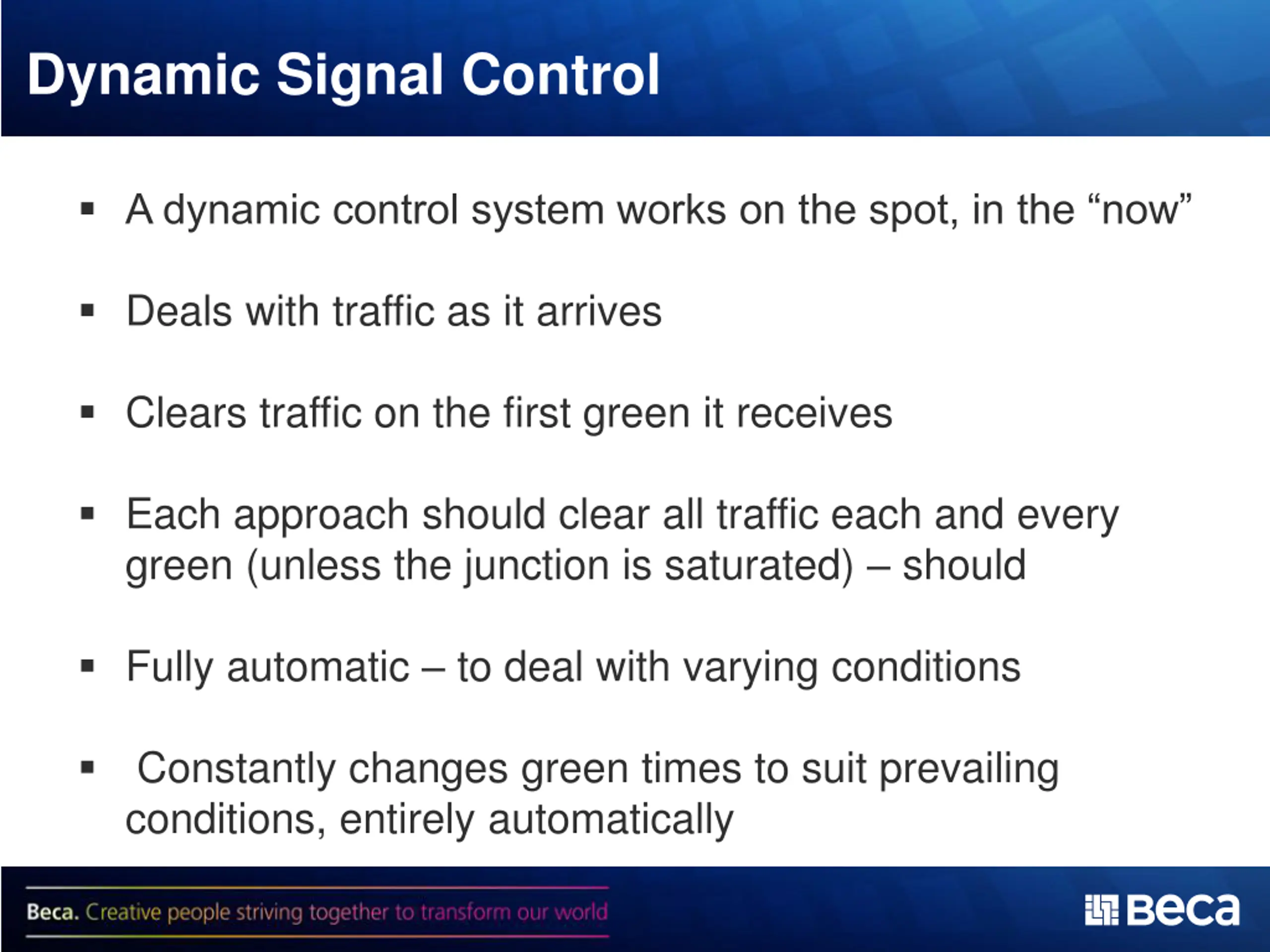 Dynamic Signal Control A dynamic control system works on the spot, in the now Deals with traffic as it arrives Clears traffic on the first green it receives Each approach should clear all traffic each and every green (unless the junction is saturated) should Fully automatic to deal with varying conditions Constantly changes green times to suit prevailing conditions, entirely automatically