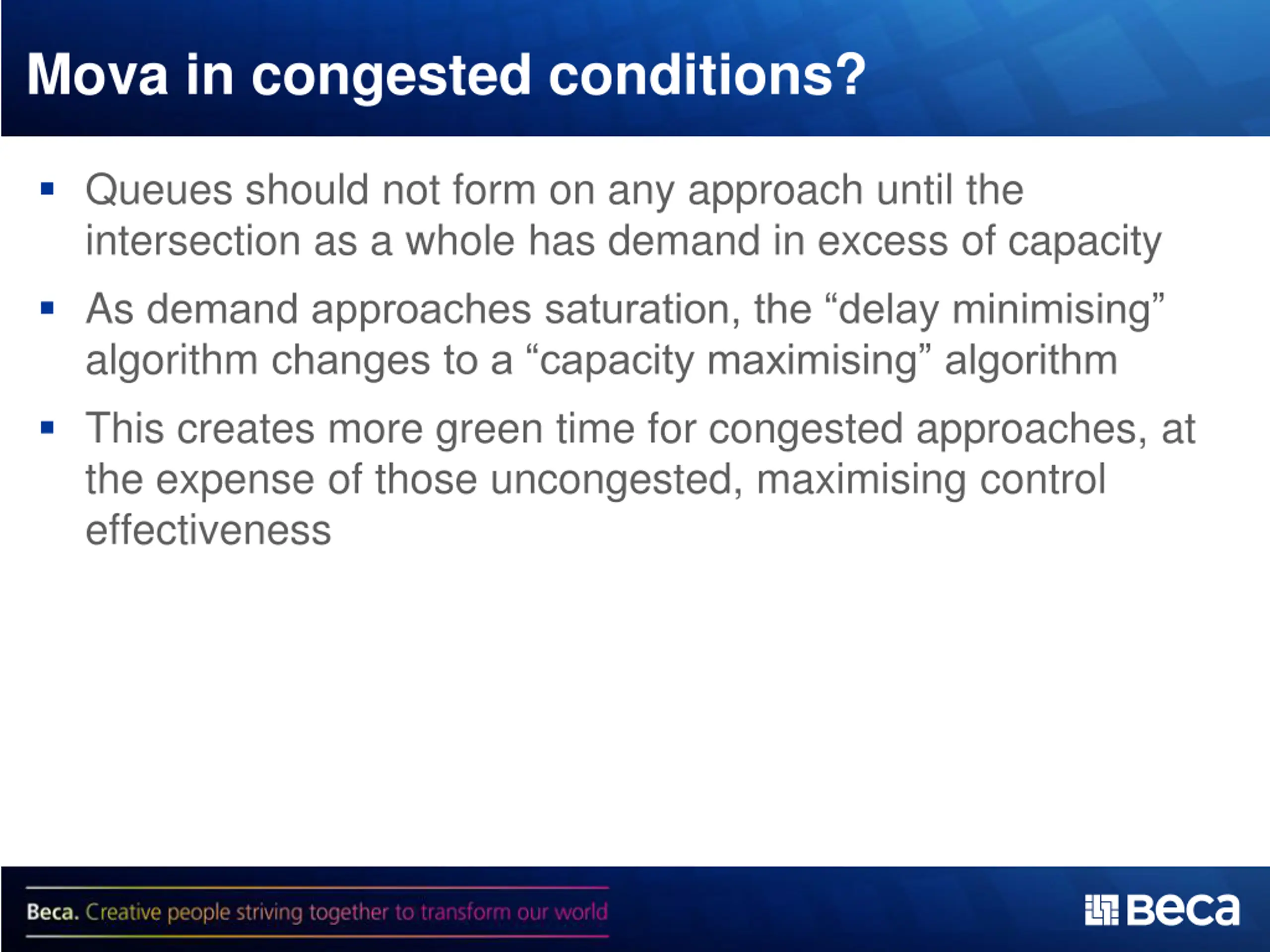 Mova in congested conditions? Queues should not form on any approach until the intersection as a whole has demand in excess of capacity As demand approaches saturation, the delay minimising algorithm changes to a capacity maximising algorithm This creates more green time for congested approaches, at the expense of those uncongested, maximising control effectiveness