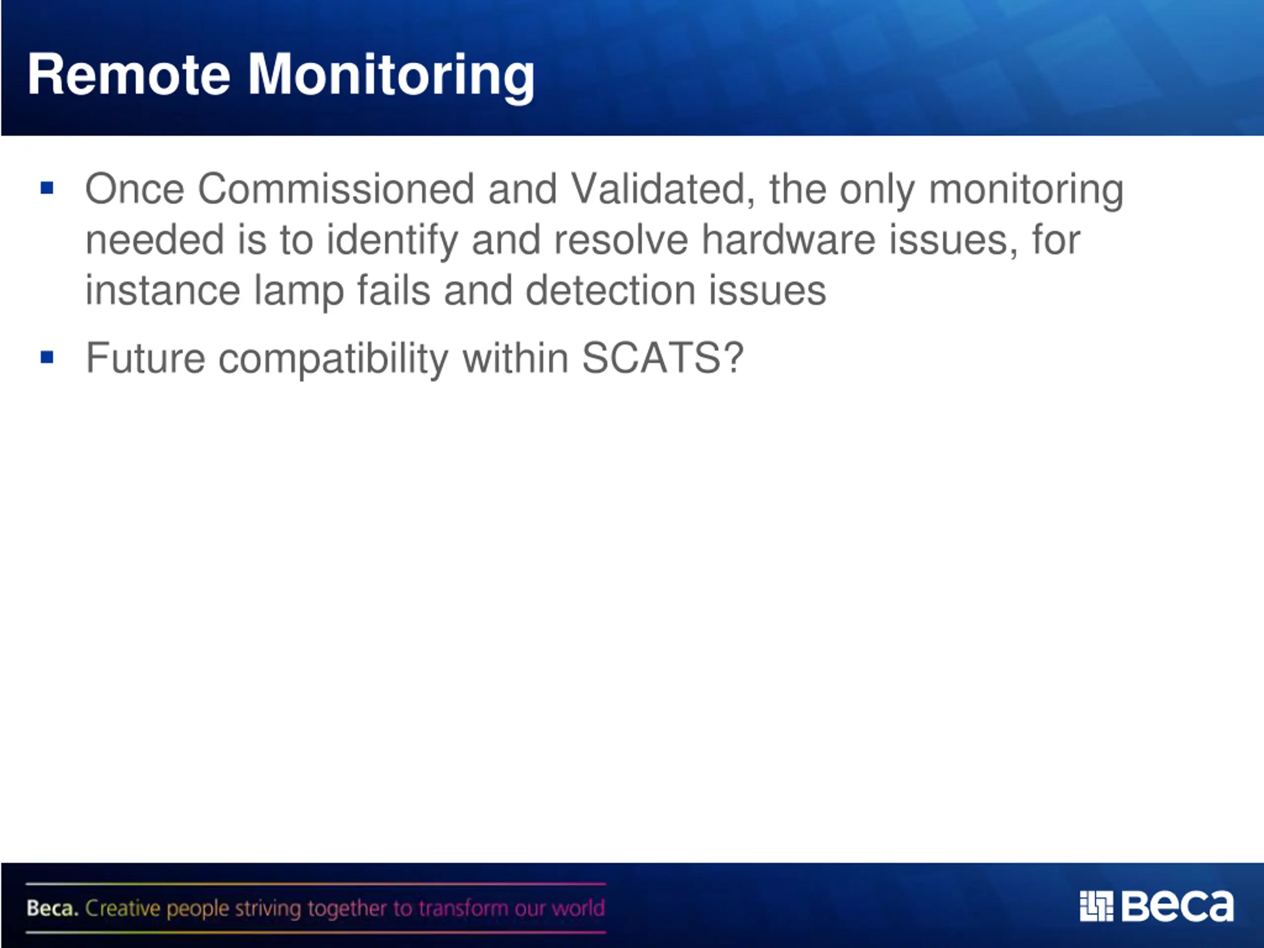 Remote Monitoring Once Commissioned and Validated, the only monitoring needed is to identify and resolve hardware issues, for instance lamp fails and detection issues Future compatibility within SCATS?
