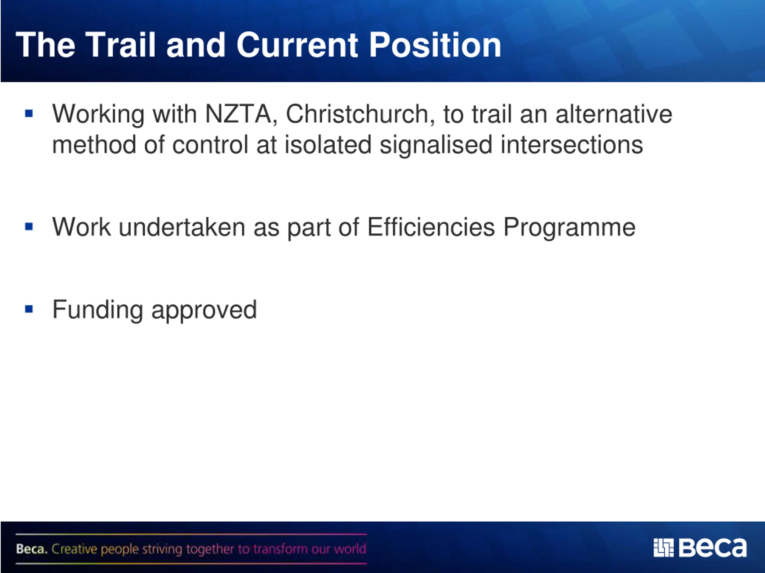The Trail and Current Position Working with NZTA, Christchurch, to trail an alternative method of control at isolated signalised intersections Work undertaken as part of Efficiencies Programme Funding approved
