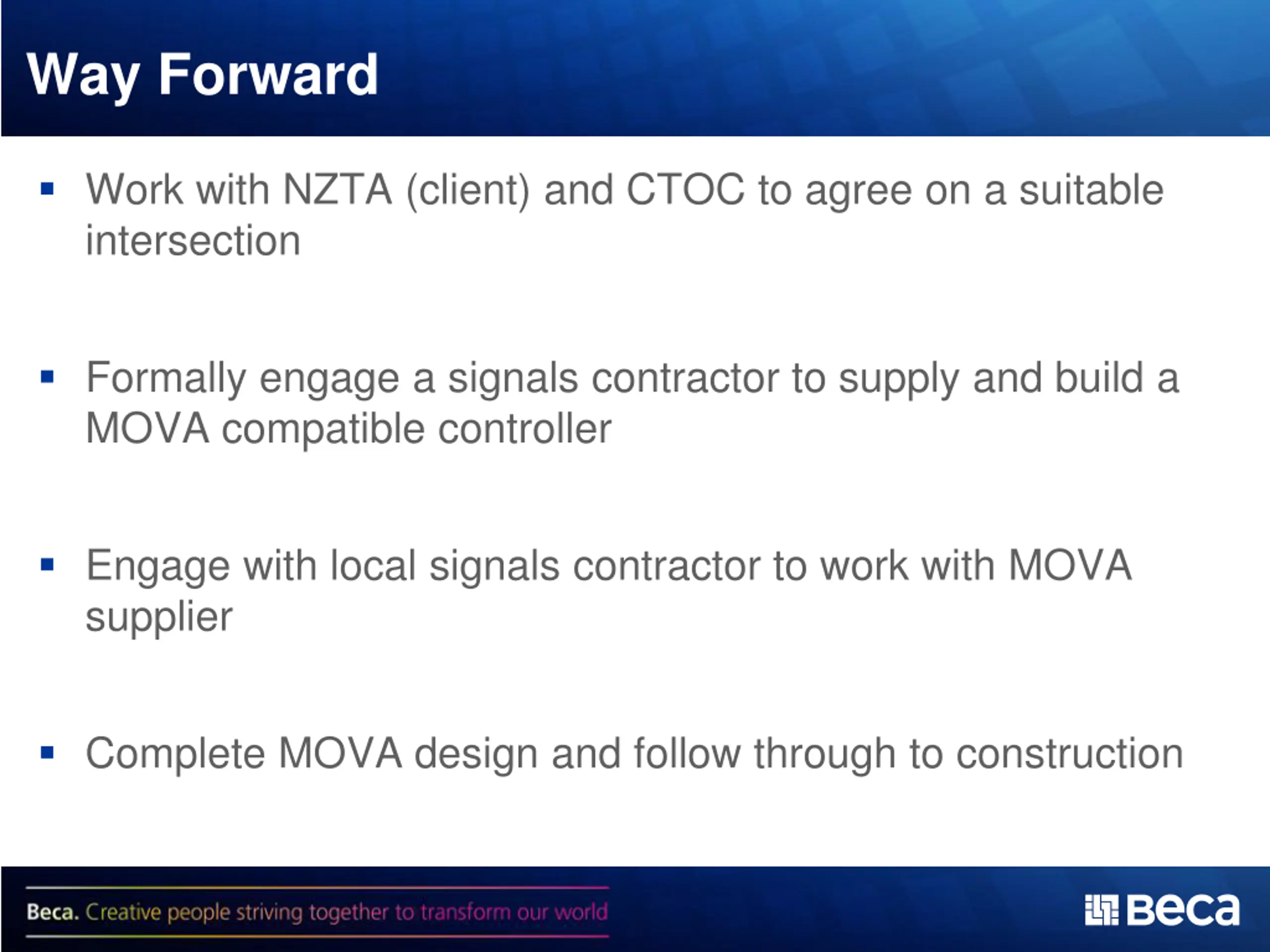 Way Forward Work with NZTA (client) and CTOC to agree on a suitable intersection Formally engage a signals contractor to supply and build a MOVA compatible controller Engage with local signals contractor to work with MOVA supplier Complete MOVA design and follow through to construction