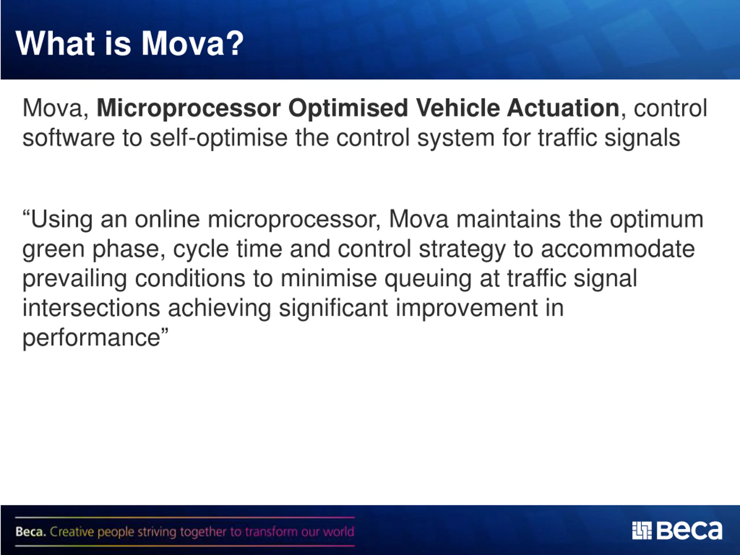 What is Mova? Mova, Microprocessor Optimised Vehicle Actuation, control software to self-optimise the control system for traffic signals Using an online microprocessor, Mova maintains the optimum green phase, cycle time and control strategy to accommodate prevailing conditions to minimise queuing at traffic signal intersections achieving significant improvement in performance