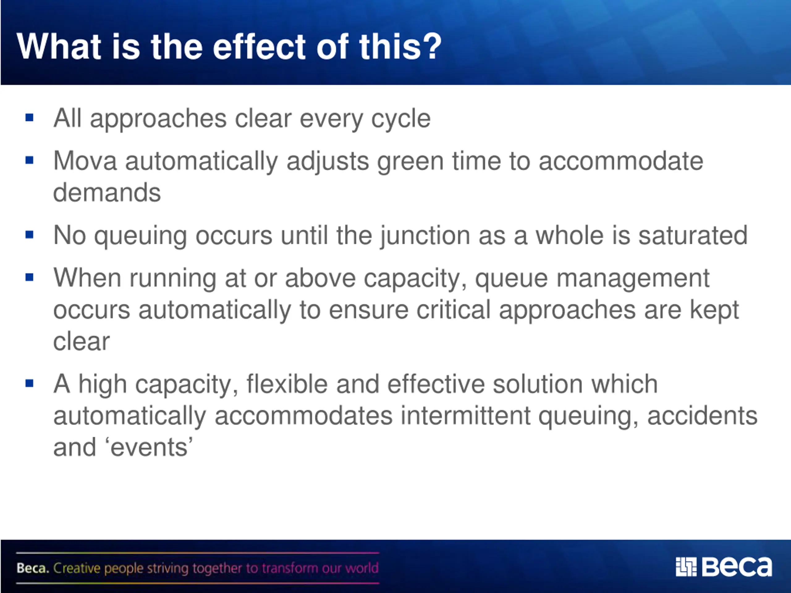 What is the effect of this? All approaches clear every cycle Mova automatically adjusts green time to accommodate demands No queuing occurs until the junction as a whole is saturated When running at or above capacity, queue management occurs automatically to ensure critical approaches are kept clear A high capacity, flexible and effective solution which automatically accommodates intermittent queuing, accidents and events
