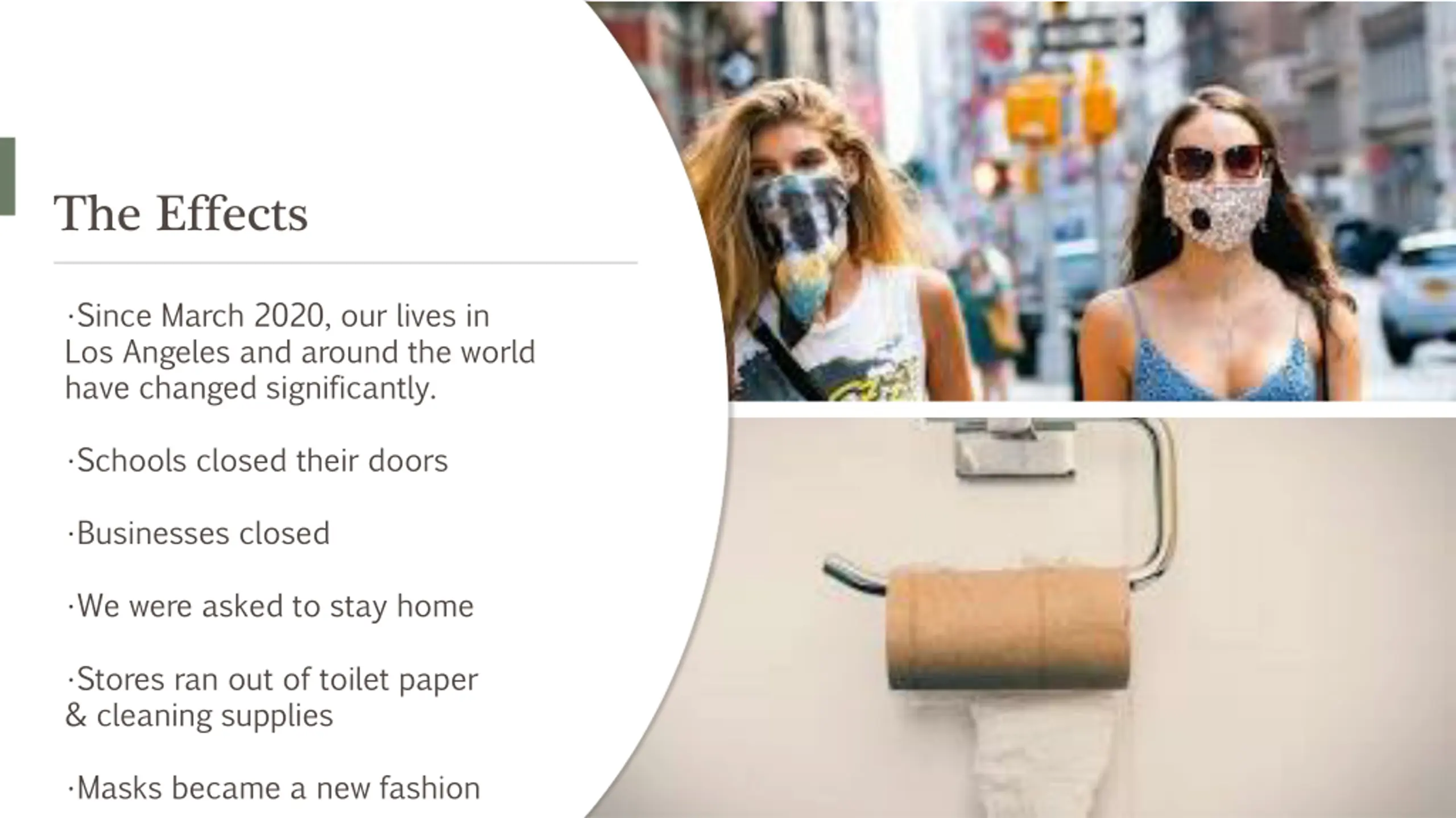 The Effects Since March 2020, our lives in Los Angeles and around the world have changed significantly. Schools closed their doors Businesses closed We were asked to stay home Stores ran out of toilet paper & cleaning supplies Masks became a new fashion