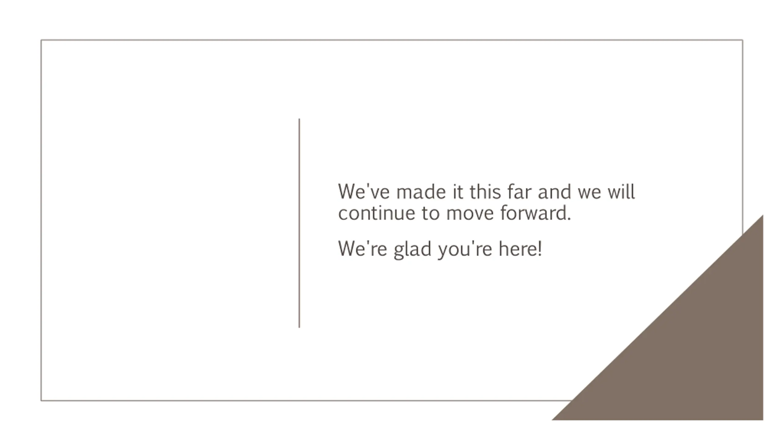 We've made it this far and we will continue to move forward. We're glad you're here!