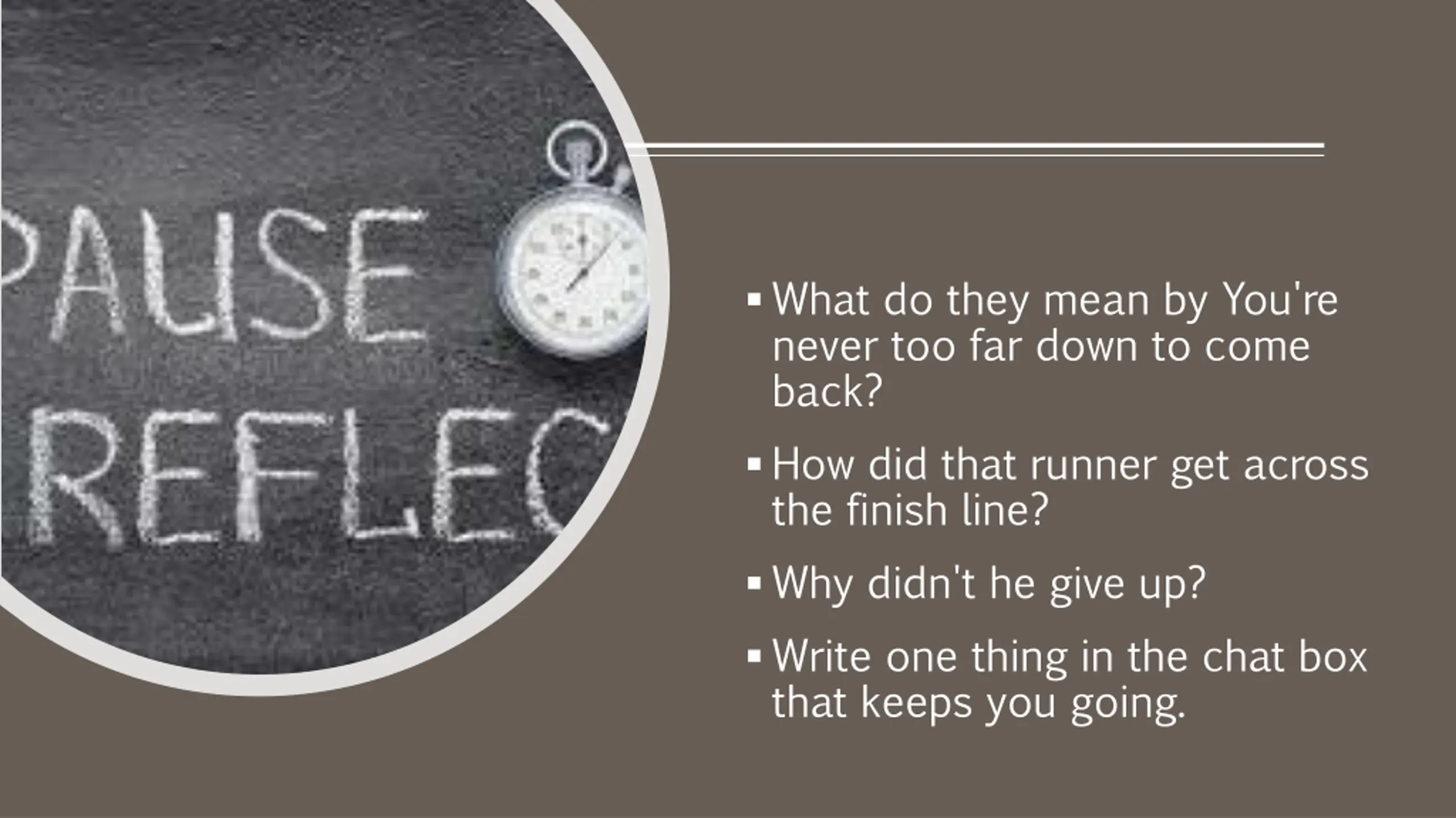 What do they mean by You're never too far down to come back? How did that runner get across the finish line? Why didn't he give up? Write one thing in the chat box that keeps you going.