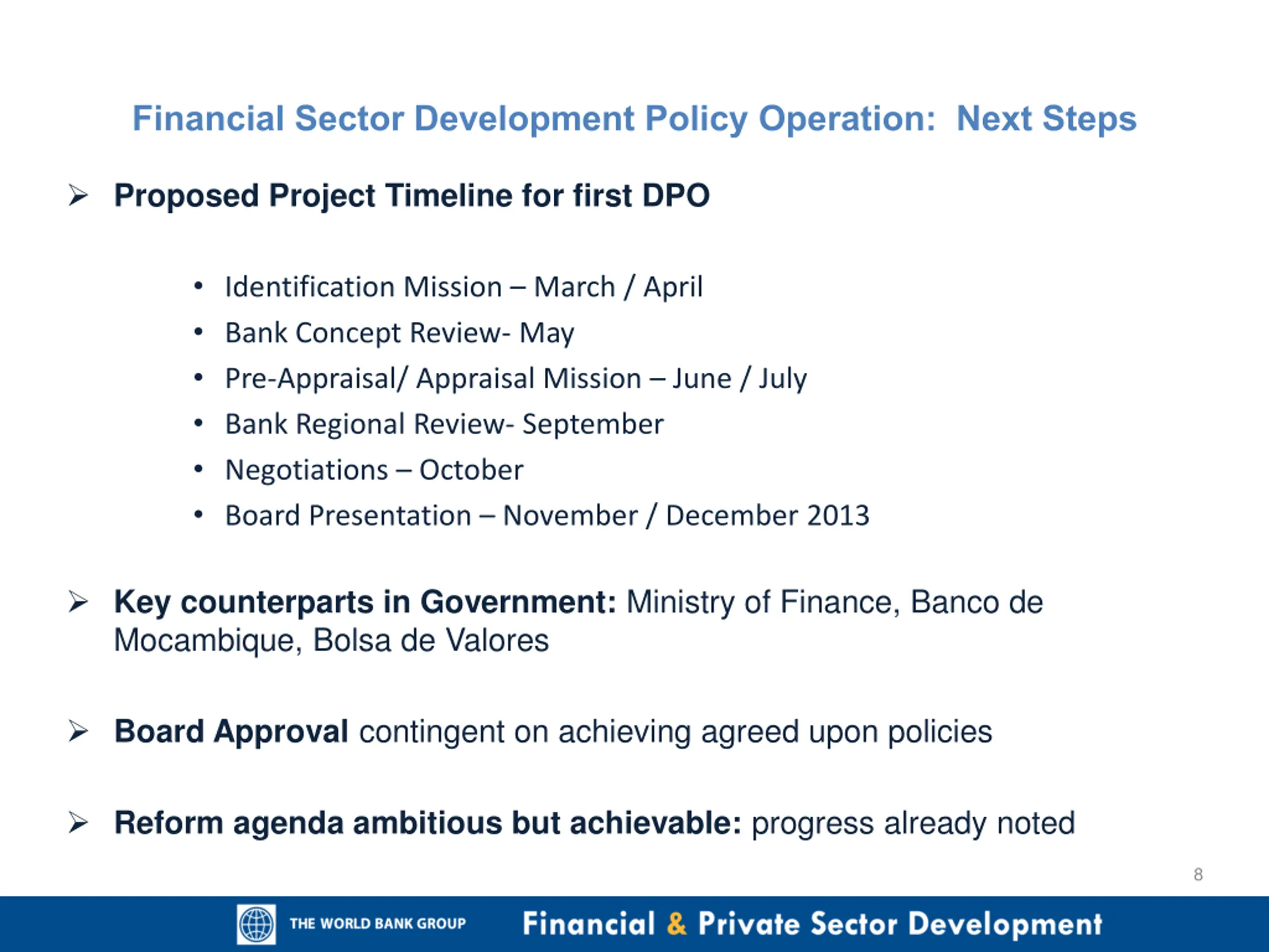 Financial Sector Development Policy Operation: Next Steps Proposed Project Timeline for first DPO Identification Mission March / April Bank Concept Review- May Pre-Appraisal/ Appraisal Mission June / July Bank Regional Review- September Negotiations October Board Presentation November / December 2013 Key counterparts in Government: Ministry of Finance, Banco de Mocambique, Bolsa de Valores Board Approval contingent on achieving agreed upon policies Reform agenda ambitious but achievable: progress already noted 8