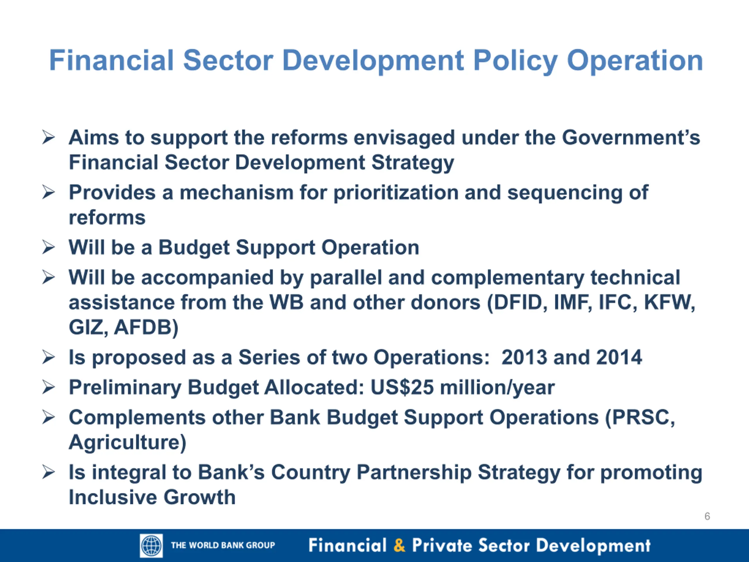 Financial Sector Development Policy Operation Aims to support the reforms envisaged under the Government s Financial Sector Development Strategy Provides a mechanism for prioritization and sequencing of reforms Will be a Budget Support Operation Will be accompanied by parallel and complementary technical assistance from the WB and other donors (DFID, IMF, IFC, KFW, GIZ, AFDB) Is proposed as a Series of two Operations: 2013 and 2014 Preliminary Budget Allocated: US$25 million/year Complements other Bank Budget Support Operations (PRSC, Agriculture) Is integral to Bank s Country Partnership Strategy for promoting Inclusive Growth 6