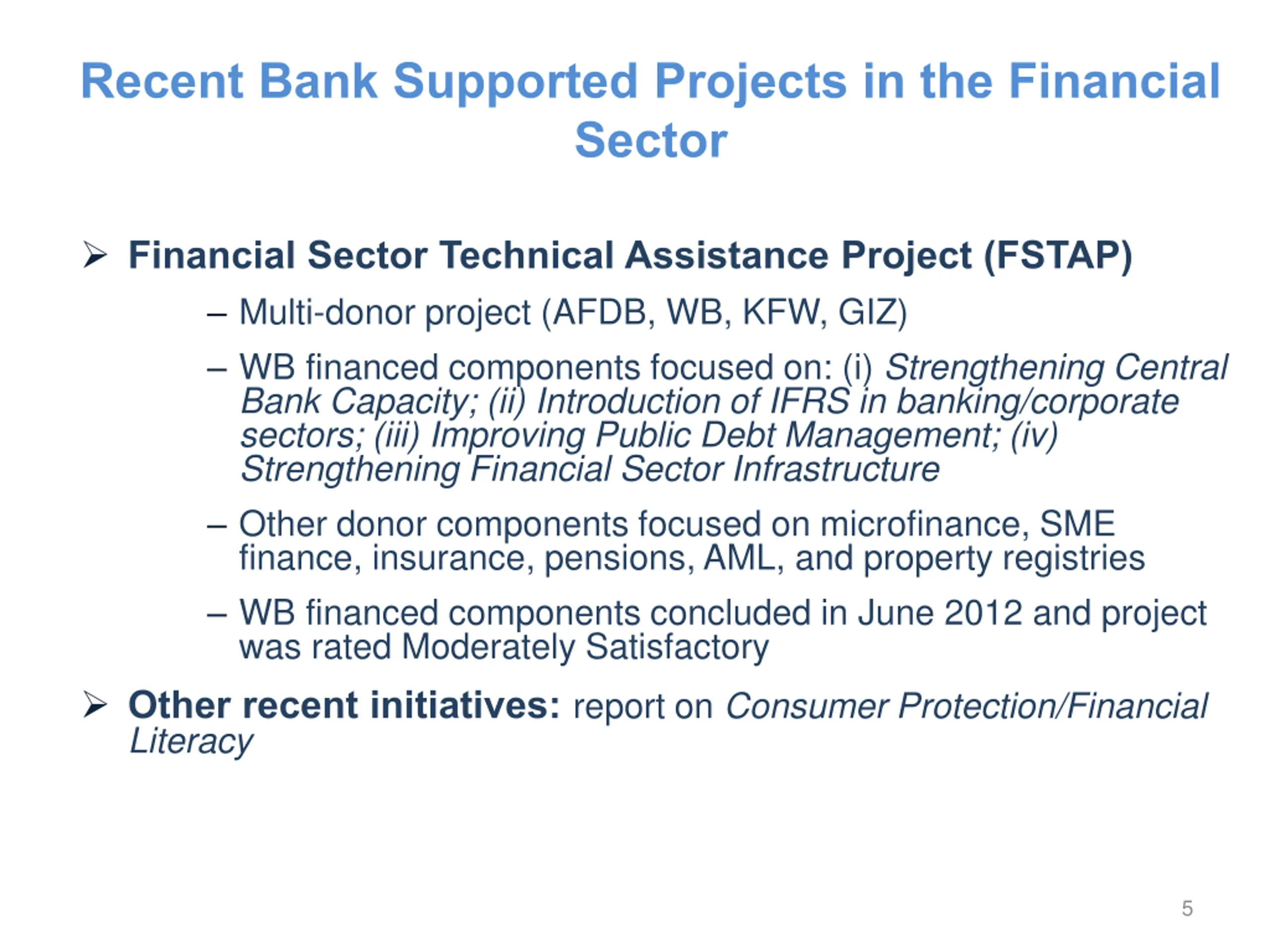Recent Bank Supported Projects in the Financial Sector Financial Sector Technical Assistance Project (FSTAP) Multi-donor project (AFDB, WB, KFW, GIZ) WB financed components focused on: (i) Strengthening Central Bank Capacity; (ii) Introduction of IFRS in banking/corporate sectors; (iii) Improving Public Debt Management; (iv) Strengthening Financial Sector Infrastructure Other donor components focused on microfinance, SME finance, insurance, pensions, AML, and property registries WB financed components concluded in June 2012 and project was rated Moderately Satisfactory Other recent initiatives: report on Consumer Protection/Financial Literacy 5