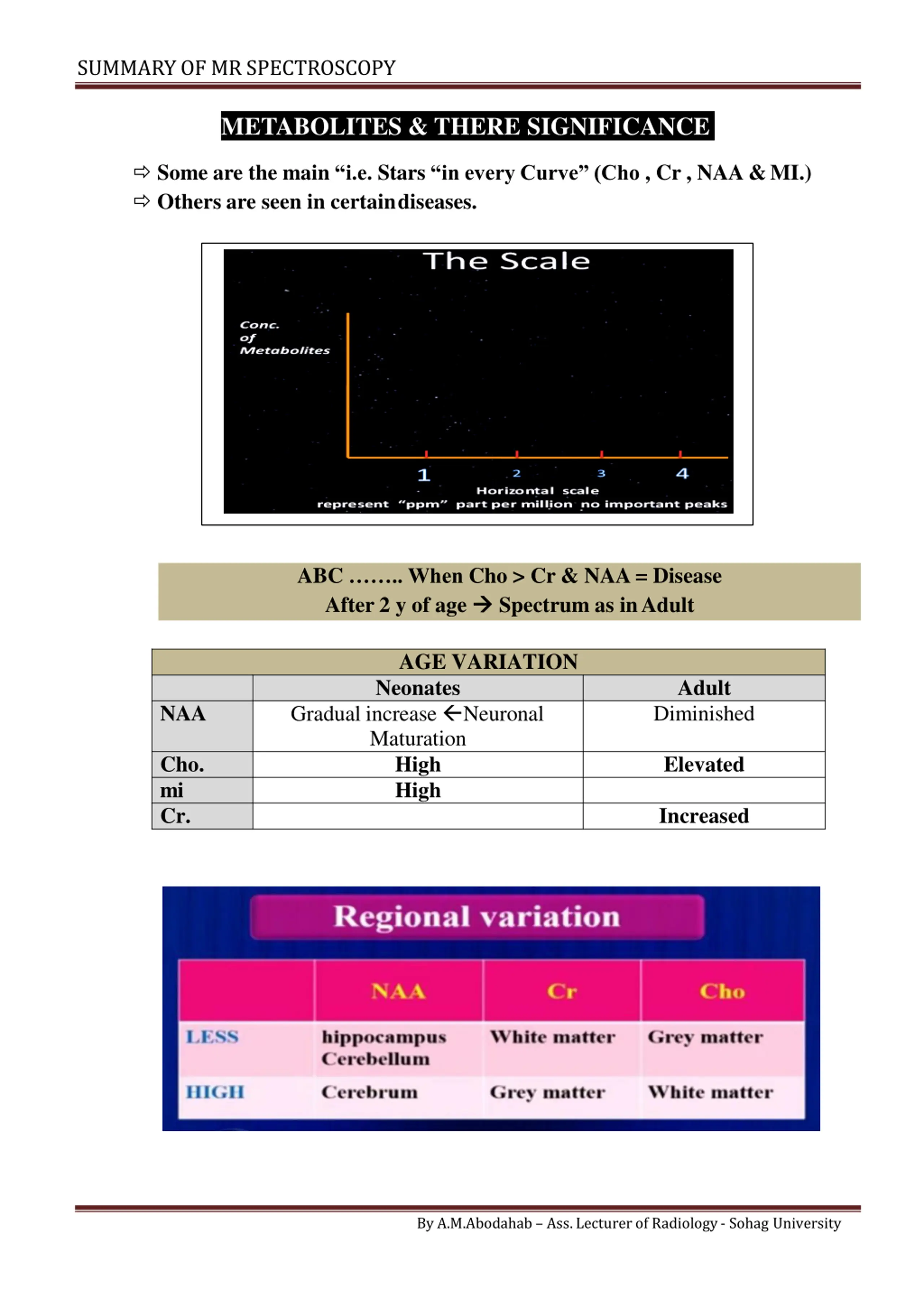SUMMARY OF MRSPECTROSCOPY METABOLITES & THERE SIGNIFICANCE Some are the main i.e. Stars in every Curve (Cho , Cr , NAA &MI.) Others are seen in certaindiseases. ABC .. When Cho > Cr & NAA = Disease After 2 y of age Spectrum as inAdult AGE VARIATION Neonates Gradual increase Neuronal Maturation High High Adult Diminished NAA Cho. mi Cr. Elevated Increased By A.M.Abodahab Ass. Lecturer of Radiology - Sohag University