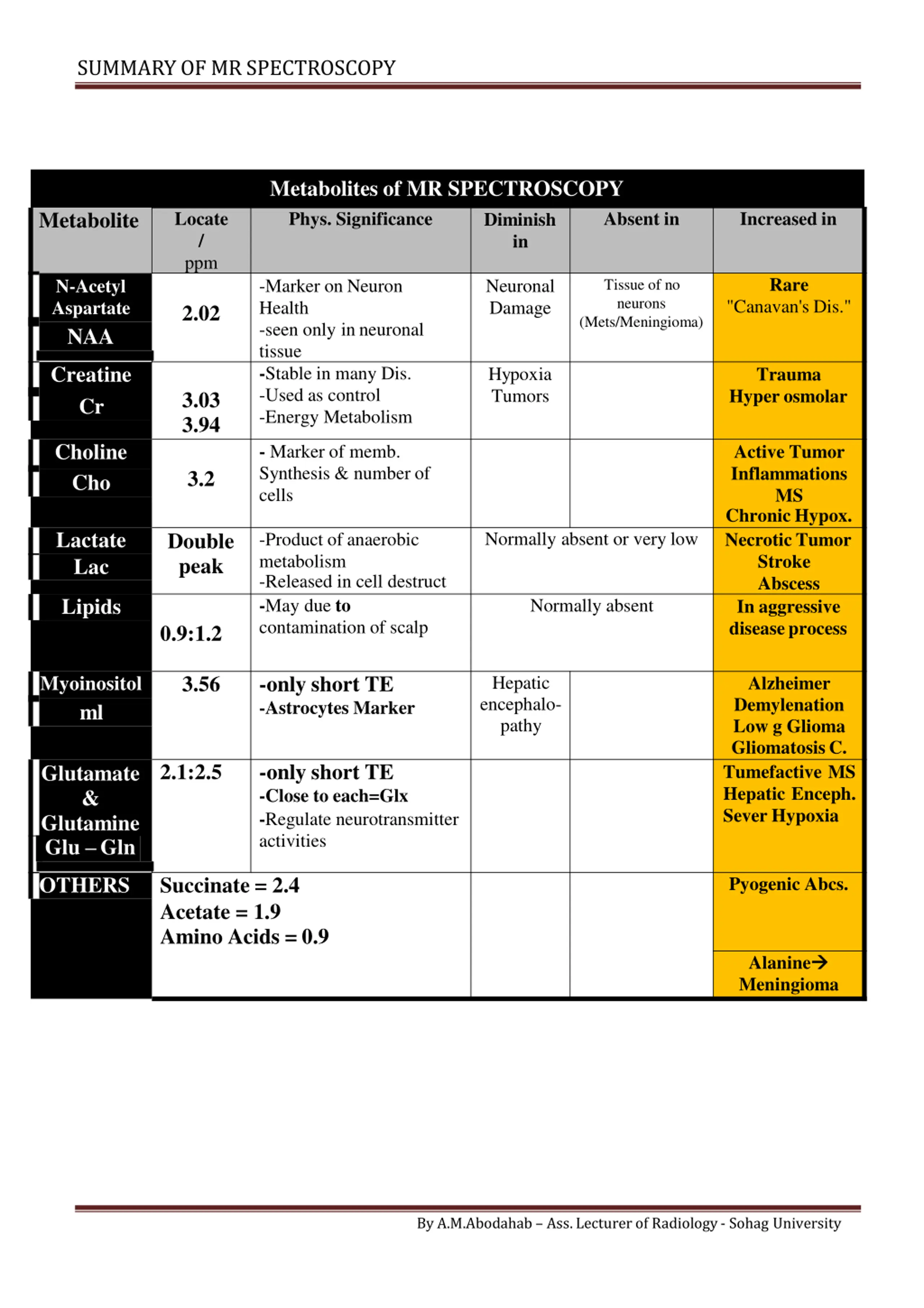 SUMMARY OF MRSPECTROSCOPY PyogenicAbscess Canavan'sDisease EpendymomaRecurrence MassiveInfarction Radiation Injury GlioblastomaMultiform Curve Of Peri LesionVoxel Raised Cho > NAA i.e. ratio > 1 Invasive edge= 1 ry Neoplasm By A.M.Abodahab Ass. Lecturer of Radiology - Sohag University