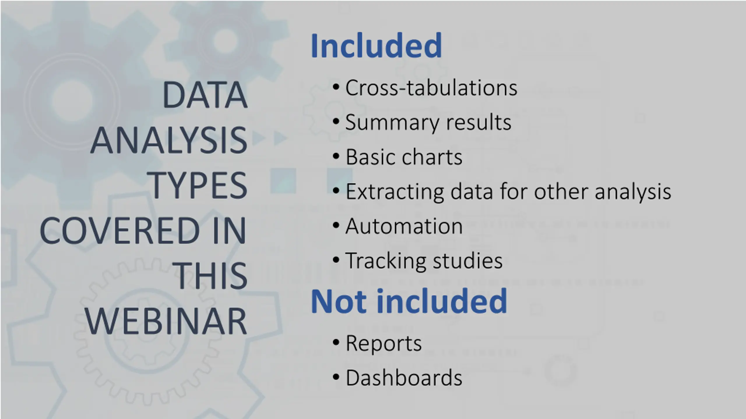 Included Cross-tabulations Summary results Basic charts Extracting data for other analysis Automation Tracking studies Not included Reports Dashboards DATA ANALYSIS TYPES COVERED IN THIS WEBINAR