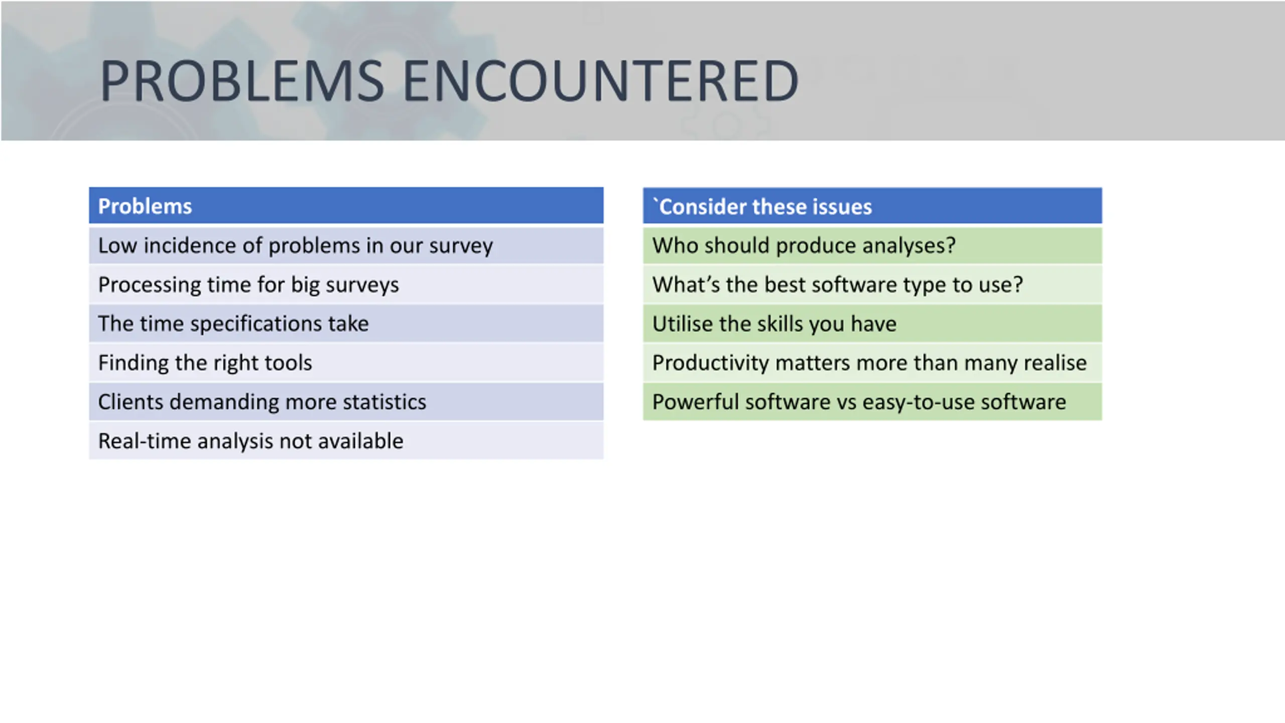 PROBLEMS ENCOUNTERED Problems `Consider these issues Low incidence of problems in our survey Who should produce analyses? Processing time for big surveys What s the best software type to use? The time specifications take Utilise the skills you have Finding the right tools Productivity matters more than many realise Clients demanding more statistics Powerful software vs easy-to-use software Real-time analysis not available