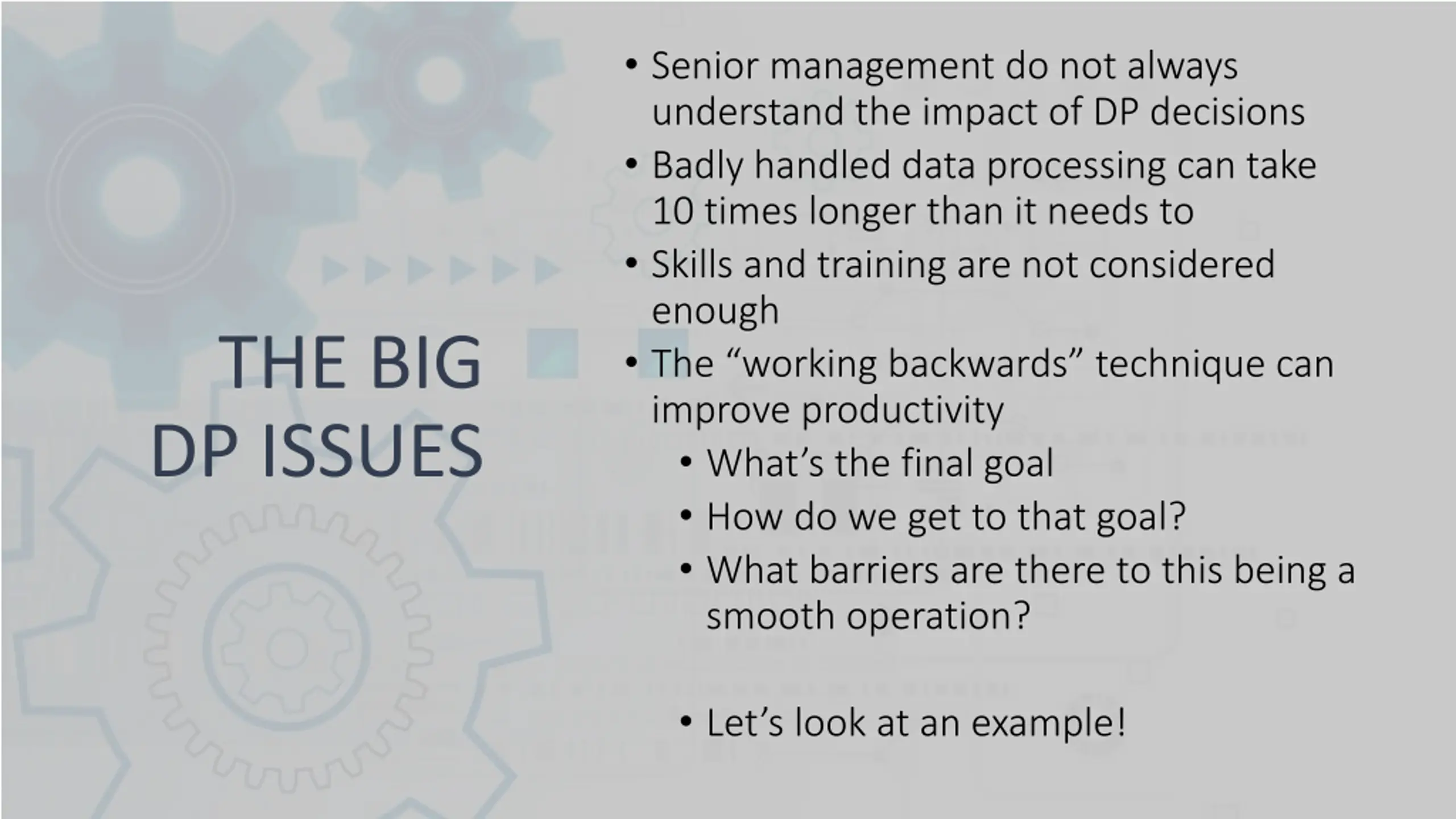 Senior management do not always understand the impact of DP decisions Badly handled data processing can take 10 times longer than it needs to Skills and training are not considered enough The working backwards technique can improve productivity What s the final goal How do we get to that goal? What barriers are there to this being a smooth operation? THE BIG DP ISSUES Let s look at an example!