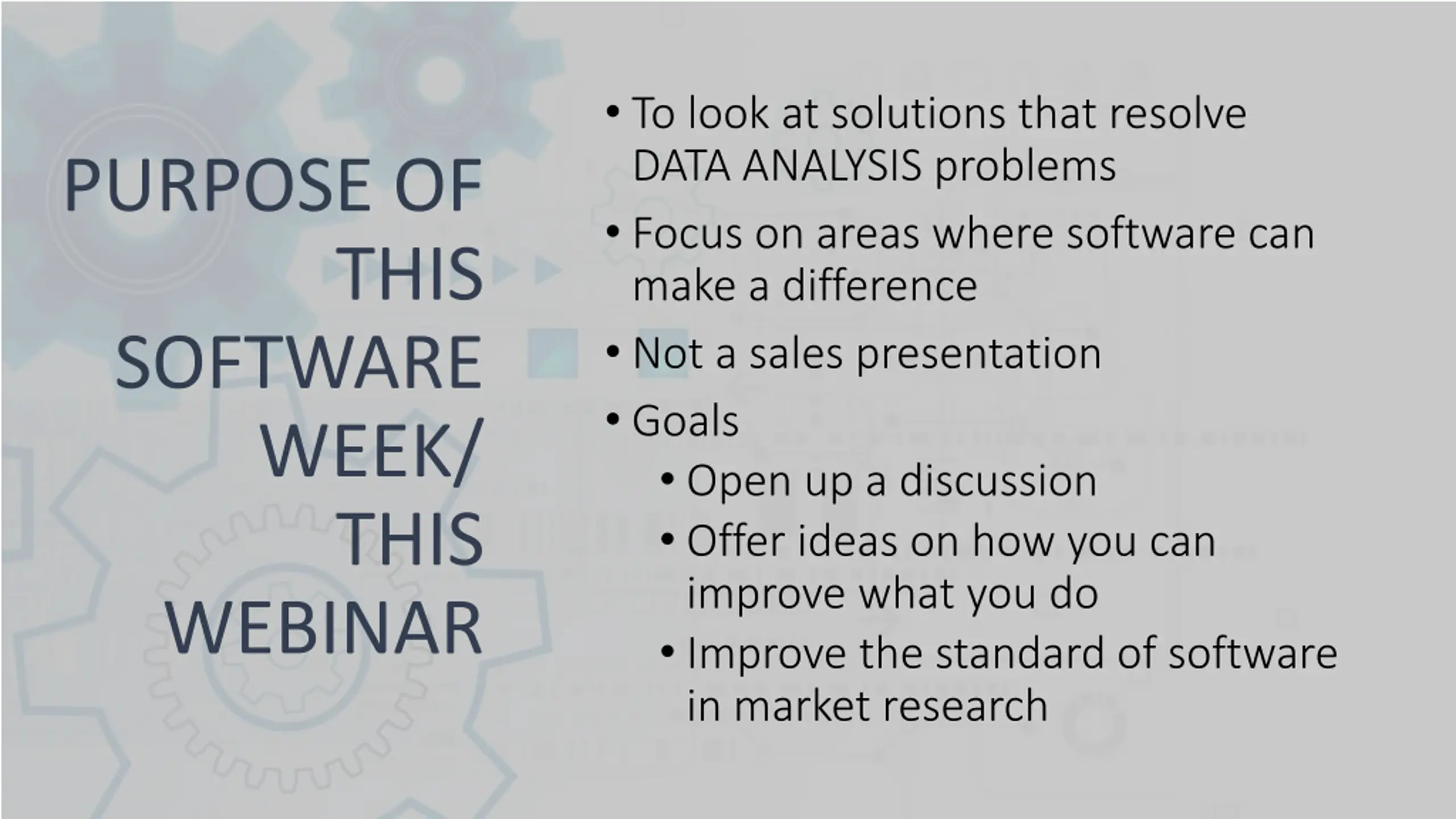 To look at solutions that resolve DATA ANALYSIS problems Focus on areas where software can make a difference Not a sales presentation Goals Open up a discussion Offer ideas on how you can improve what you do Improve the standard of software in market research PURPOSE OF THIS SOFTWARE WEEK/ THIS WEBINAR