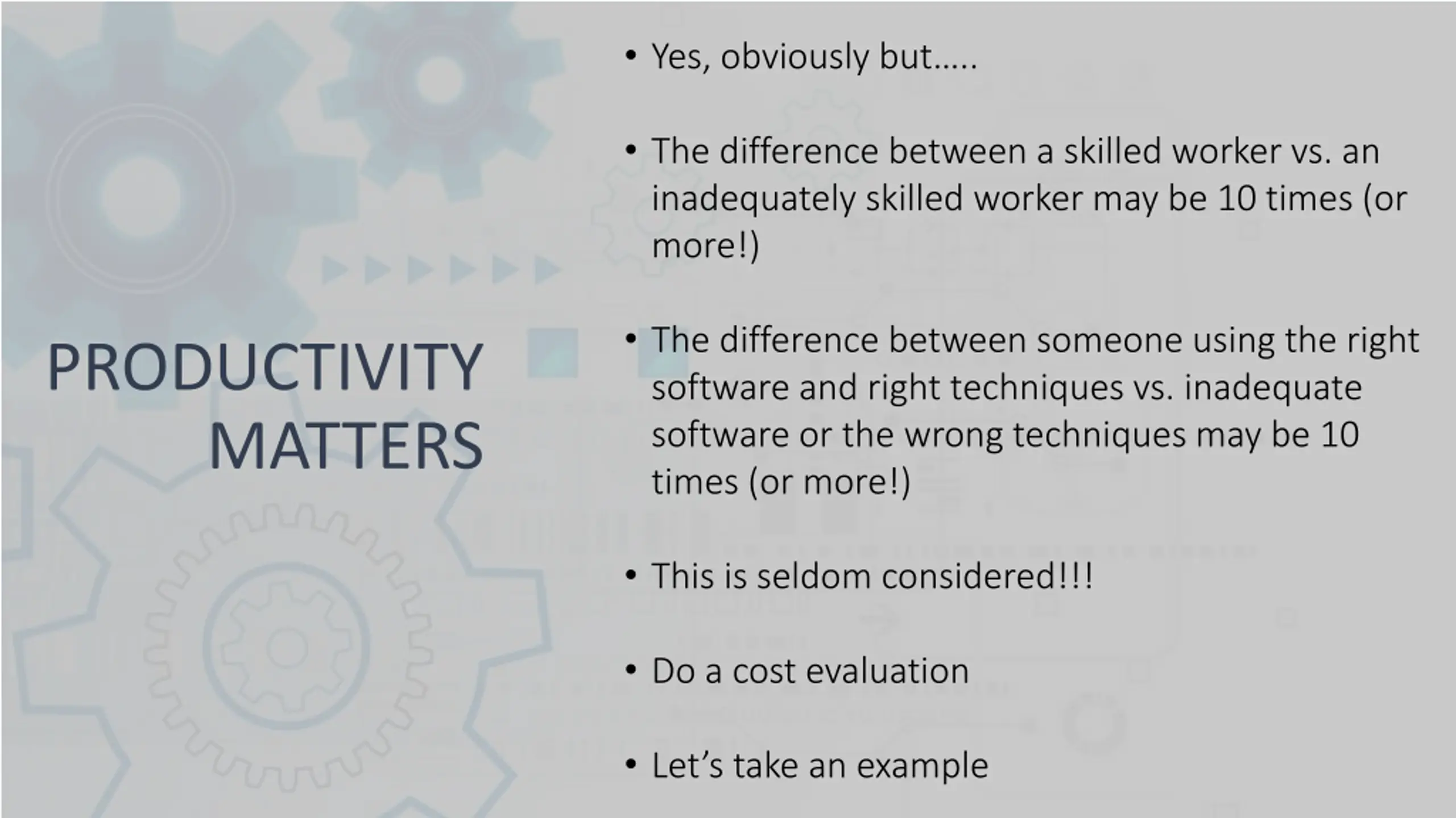 Yes, obviously but.. The difference between a skilled worker vs. an inadequately skilled worker may be 10 times (or more!) The difference between someone using the right software and right techniques vs. inadequate software or the wrong techniques may be 10 times (or more!) PRODUCTIVITY MATTERS This is seldom considered!!! Do a cost evaluation Let s take an example