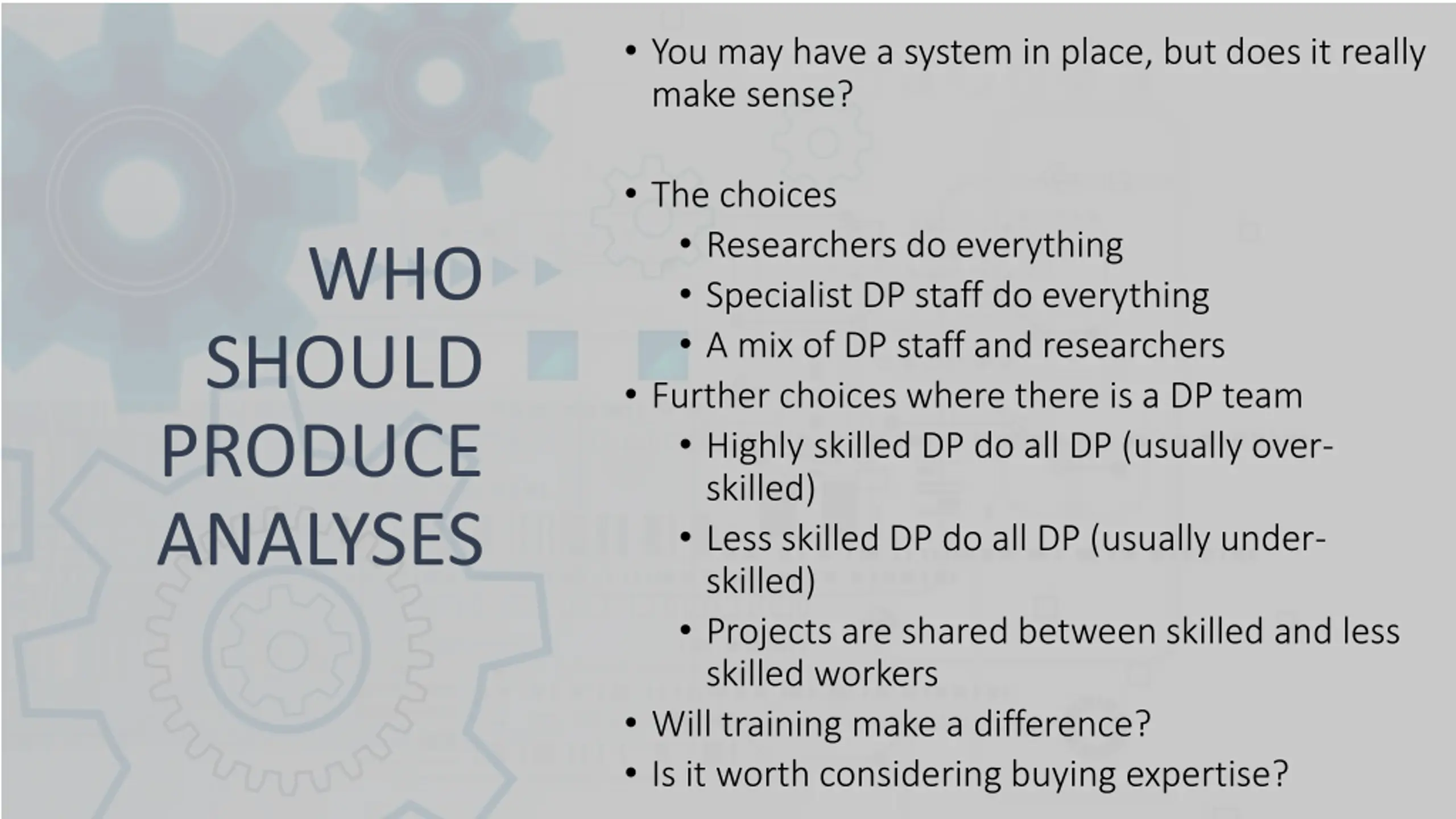 You may have a system in place, but does it really make sense? The choices Researchers do everything Specialist DP staff do everything A mix of DP staff and researchers Further choices where there is a DP team Highly skilled DP do all DP (usually over- skilled) Less skilled DP do all DP (usually under- skilled) Projects are shared between skilled and less skilled workers Will training make a difference? Is it worth considering buying expertise? WHO SHOULD PRODUCE ANALYSES
