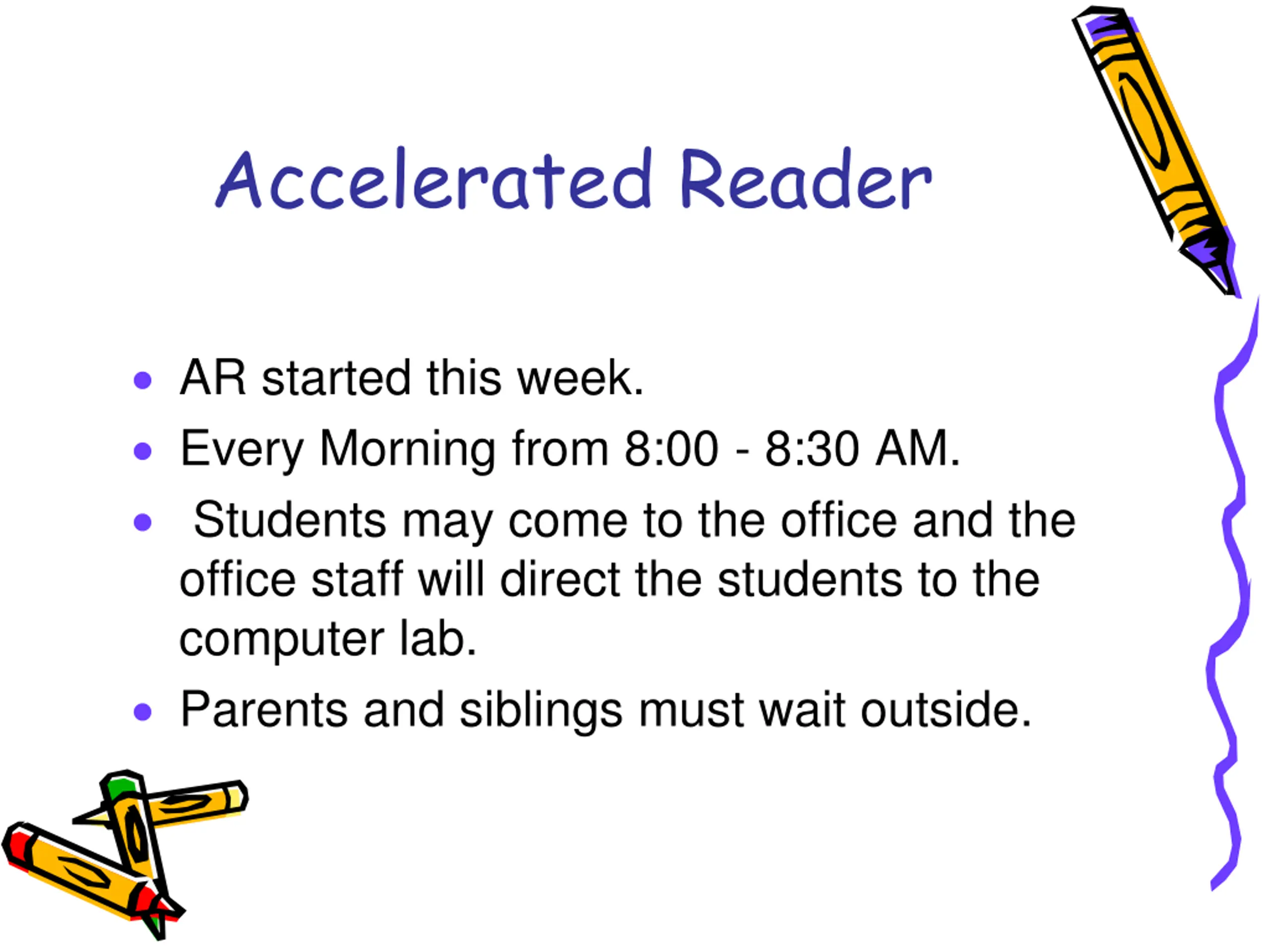 Accelerated Reader AR started this week. Every Morning from 8:00 - 8:30 AM. Students may come to the office and the office staff will direct the students to the computer lab. Parents and siblings must wait outside.