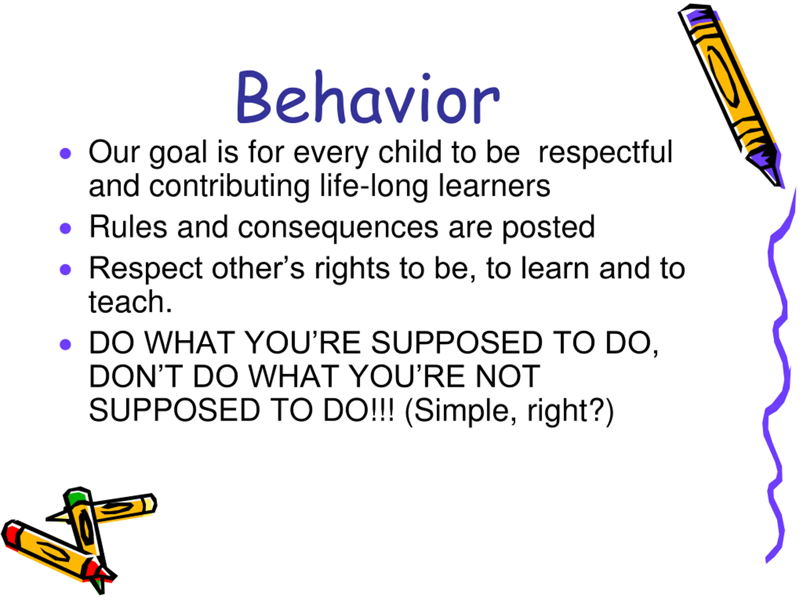 Behavior Our goal is for every child to be respectful and contributing life-long learners Rules and consequences are posted Respect other s rights to be, to learn and to teach. DO WHAT YOU RE SUPPOSED TO DO, DON T DO WHAT YOU RE NOT SUPPOSED TO DO!!! (Simple, right?)