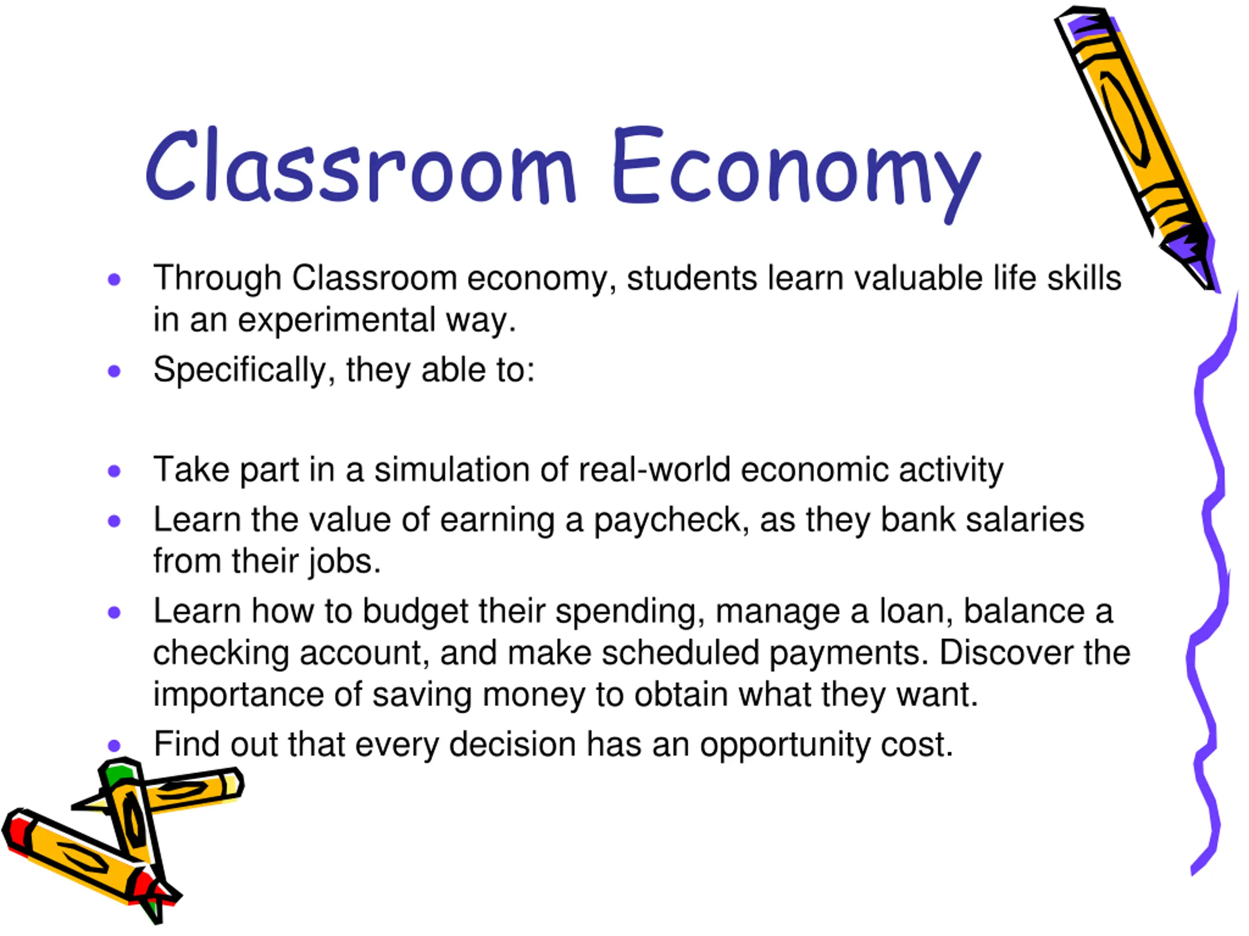 Classroom Economy Through Classroom economy, students learn valuable life skills in an experimental way. Specifically, they able to: Take part in a simulation of real-world economic activity Learn the value of earning a paycheck, as they bank salaries from their jobs. Learn how to budget their spending, manage a loan, balance a checking account, and make scheduled payments. Discover the importance of saving money to obtain what they want. Find out that every decision has an opportunity cost.