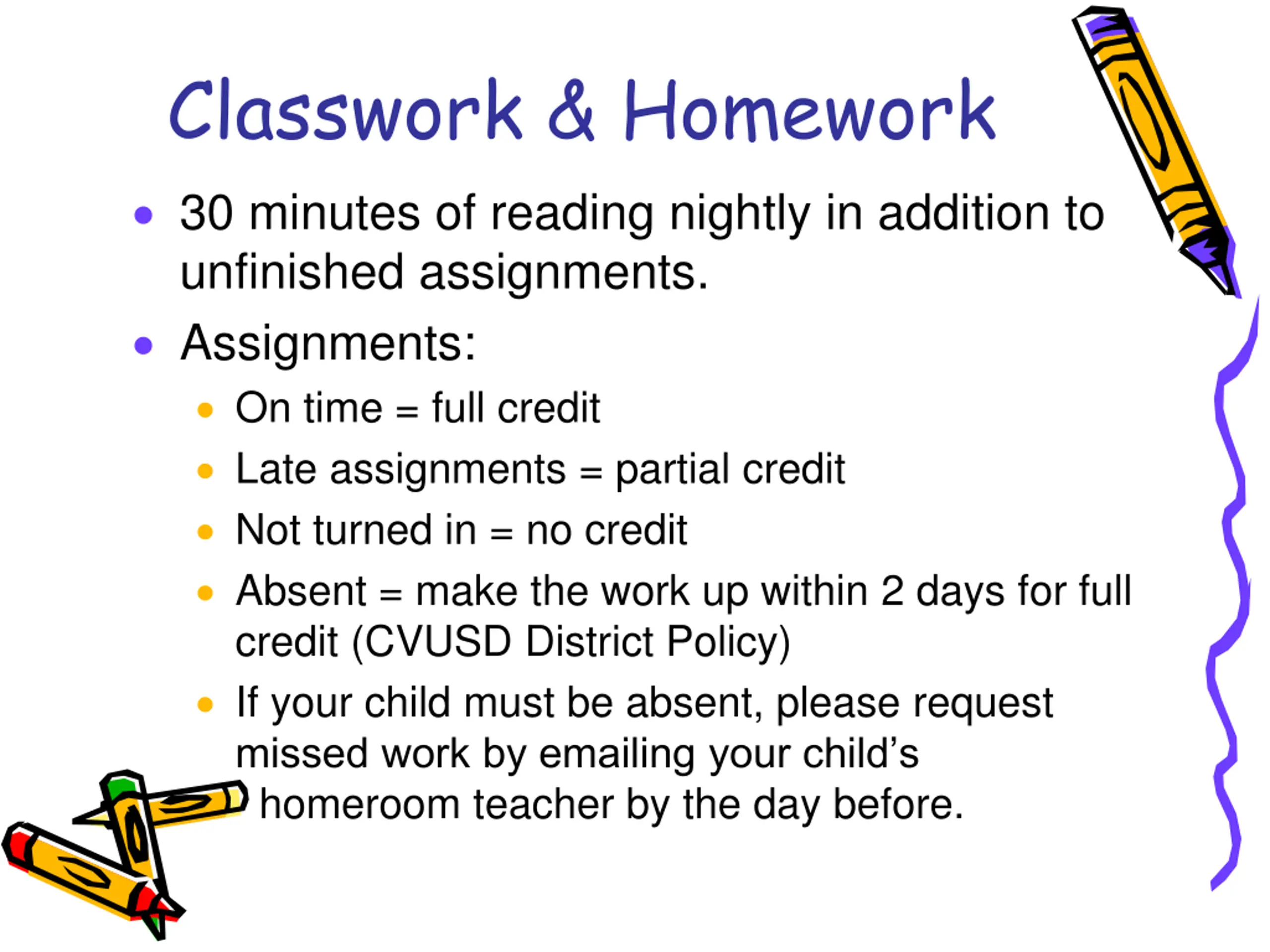 Classwork & Homework 30 minutes of reading nightly in addition to unfinished assignments. Assignments: On time = full credit Late assignments = partial credit Not turned in = no credit Absent = make the work up within 2 days for full credit (CVUSD District Policy) If your child must be absent, please request missed work by emailing your child s homeroom teacher by the day before.