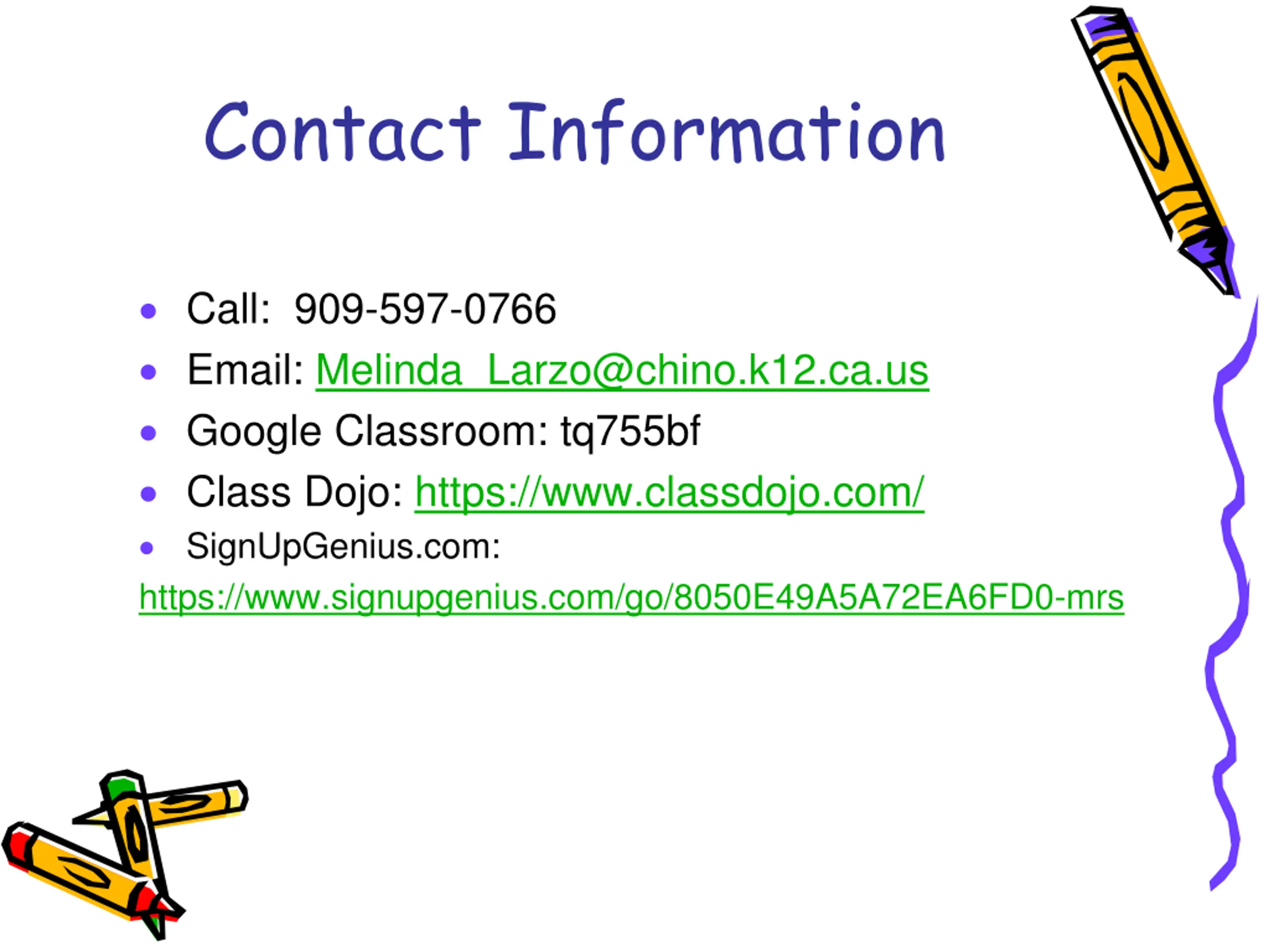 Contact Information Call: 909-597-0766 Email: Melinda_Larzo@chino.k12.ca.us Google Classroom: tq755bf Class Dojo: https://www.classdojo.com/ SignUpGenius.com: https://www.signupgenius.com/go/8050E49A5A72EA6FD0-mrs