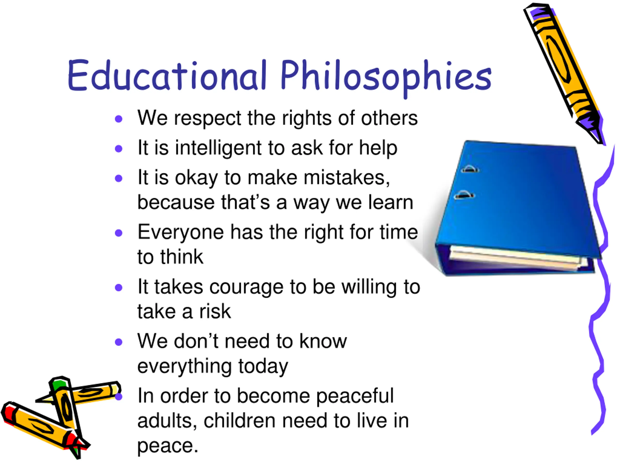 Educational Philosophies We respect the rights of others It is intelligent to ask for help It is okay to make mistakes, because that s a way we learn Everyone has the right for time to think It takes courage to be willing to take a risk We don t need to know everything today In order to become peaceful adults, children need to live in peace.