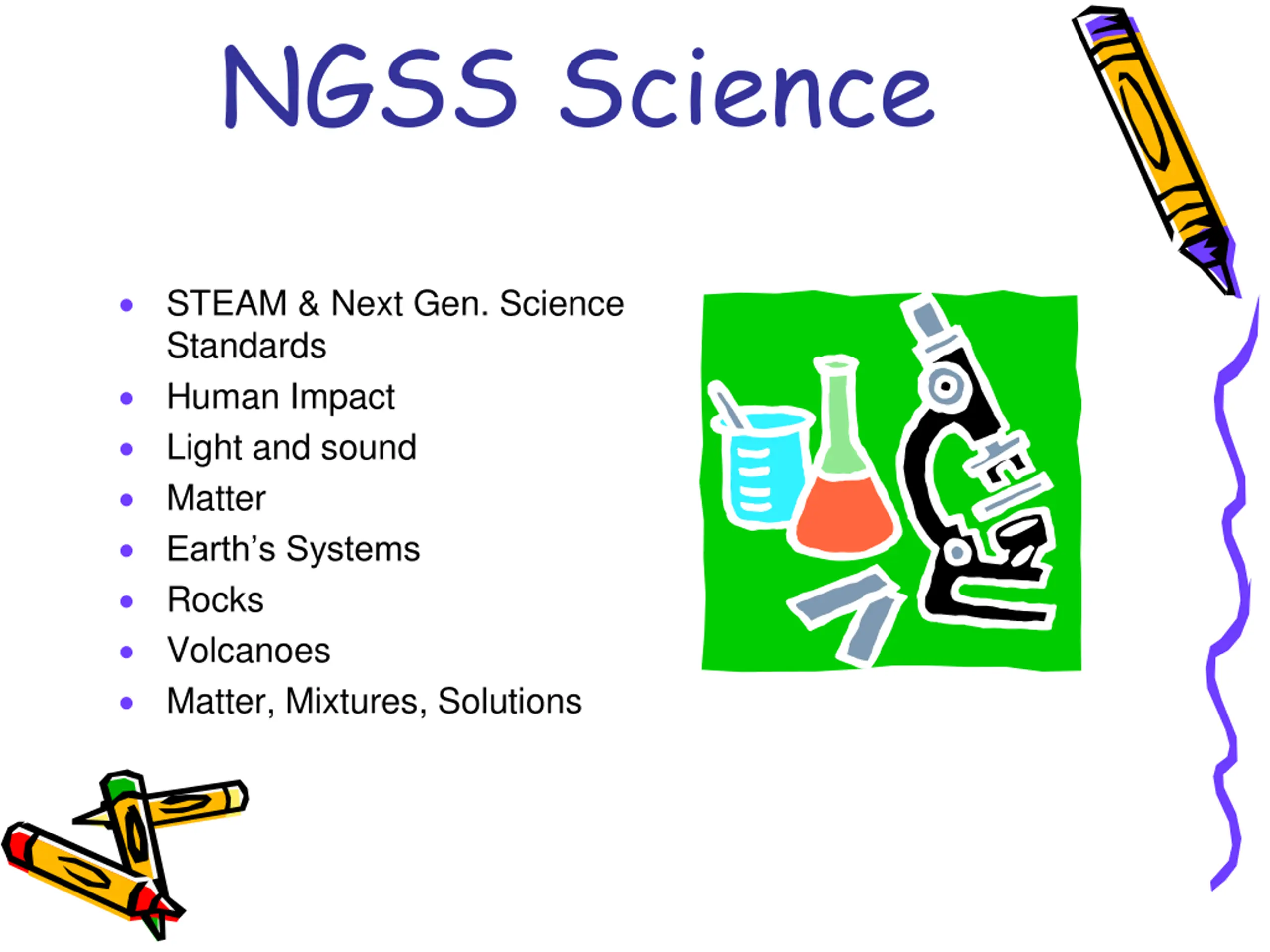 NGSS Science STEAM & Next Gen. Science Standards Human Impact Light and sound Matter Earth s Systems Rocks Volcanoes Matter, Mixtures, Solutions