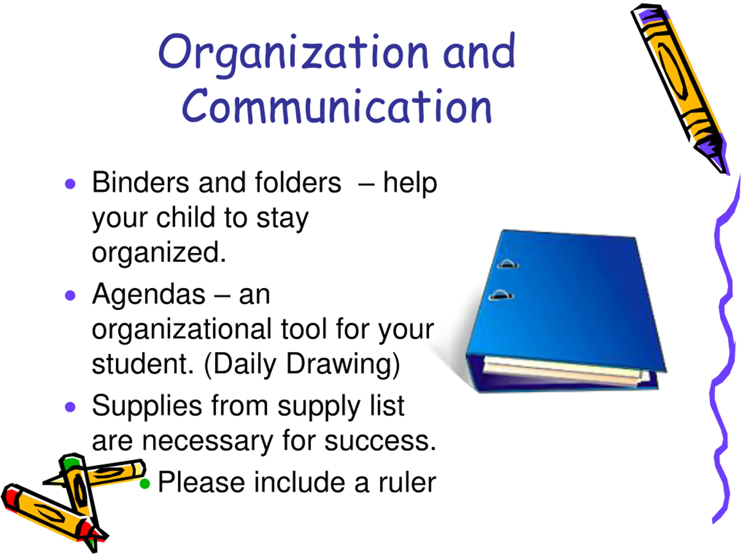 Organization and Communication Binders and folders help your child to stay organized. Agendas an organizational tool for your student. (Daily Drawing) Supplies from supply list are necessary for success. Please include a ruler