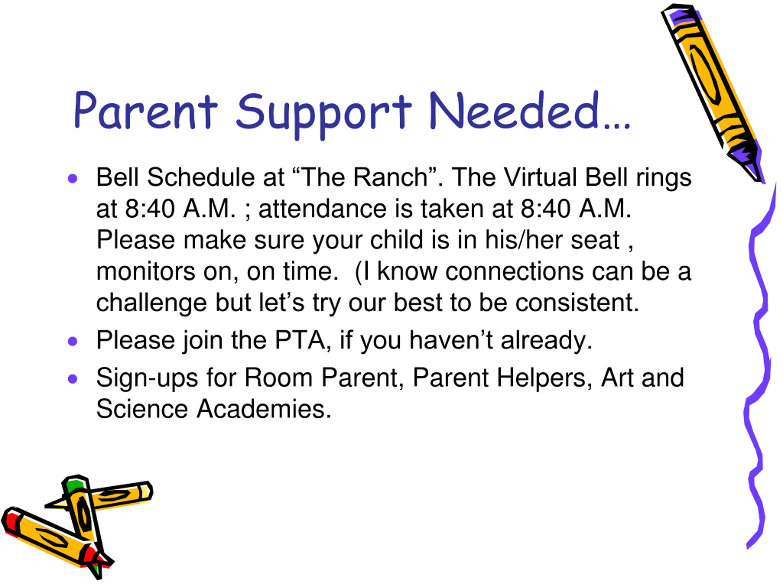 Parent Support Needed Bell Schedule at The Ranch . The Virtual Bell rings at 8:40 A.M. ; attendance is taken at 8:40 A.M. Please make sure your child is in his/her seat , monitors on, on time. (I know connections can be a challenge but let s try our best to be consistent. Please join the PTA, if you haven t already. Sign-ups for Room Parent, Parent Helpers, Art and Science Academies.