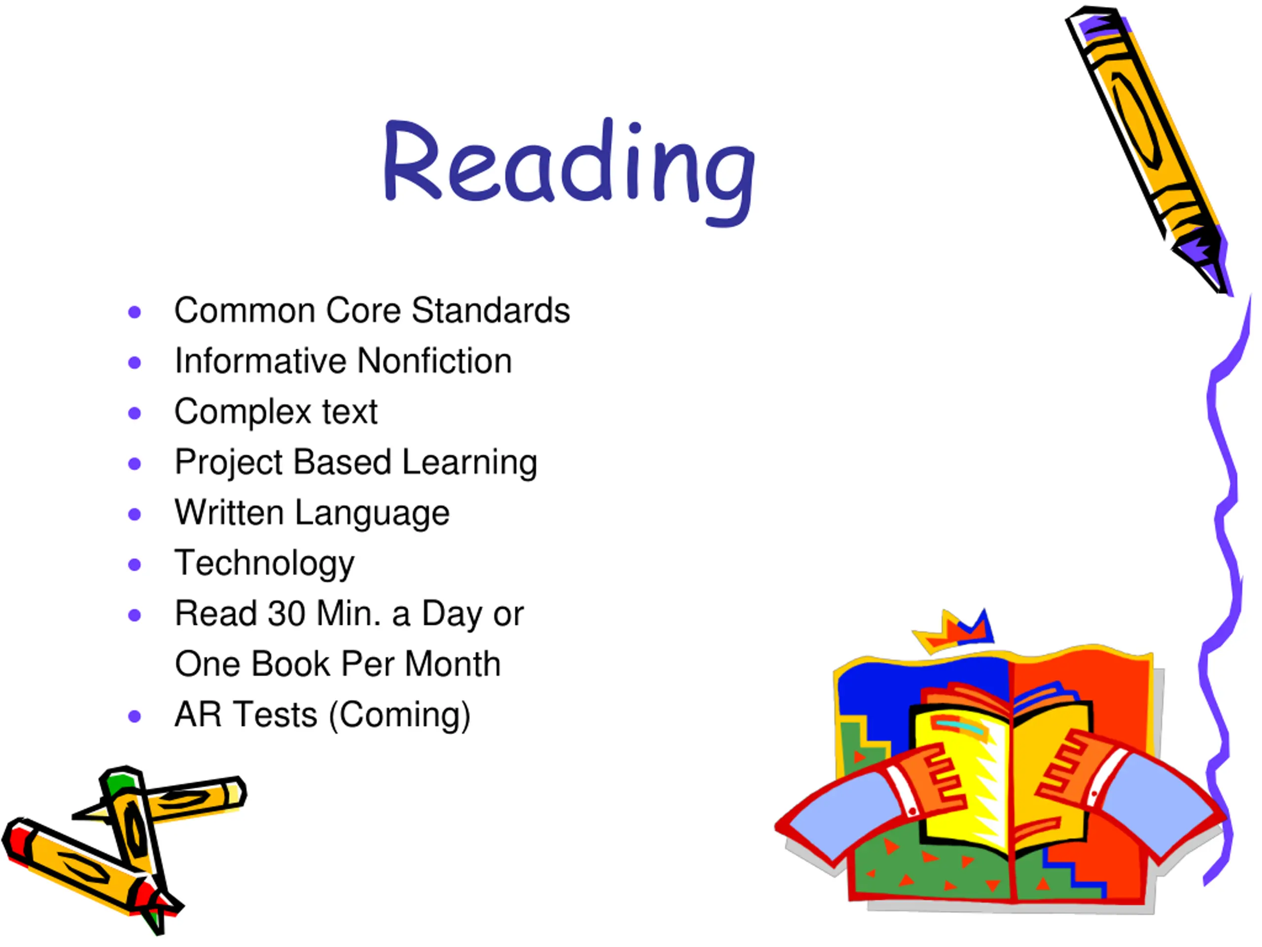 Reading Common Core Standards Informative Nonfiction Complex text Project Based Learning Written Language Technology Read 30 Min. a Day or One Book Per Month AR Tests (Coming)