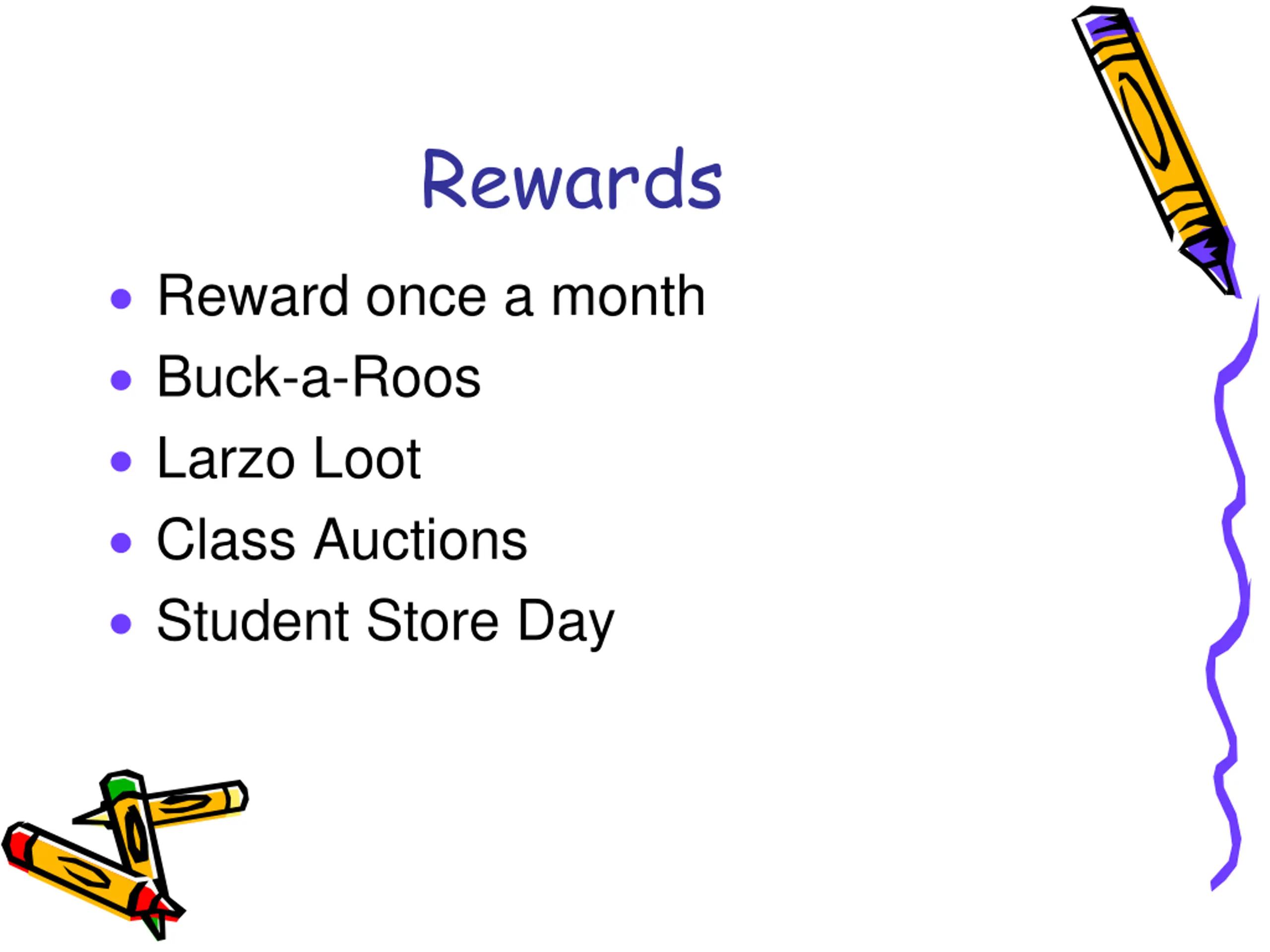 Rewards Reward once a month Buck-a-Roos Larzo Loot Class Auctions Student Store Day