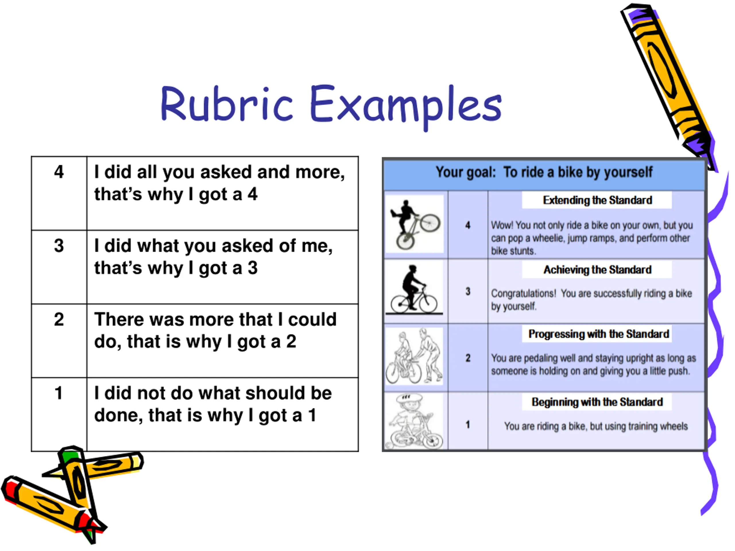 Rubric Examples 4 I did all you asked and more, that s why I got a 4 3 I did what you asked of me, that s why I got a 3 2 There was more that I could do, that is why I got a 2 1 I did not do what should be done, that is why I got a 1