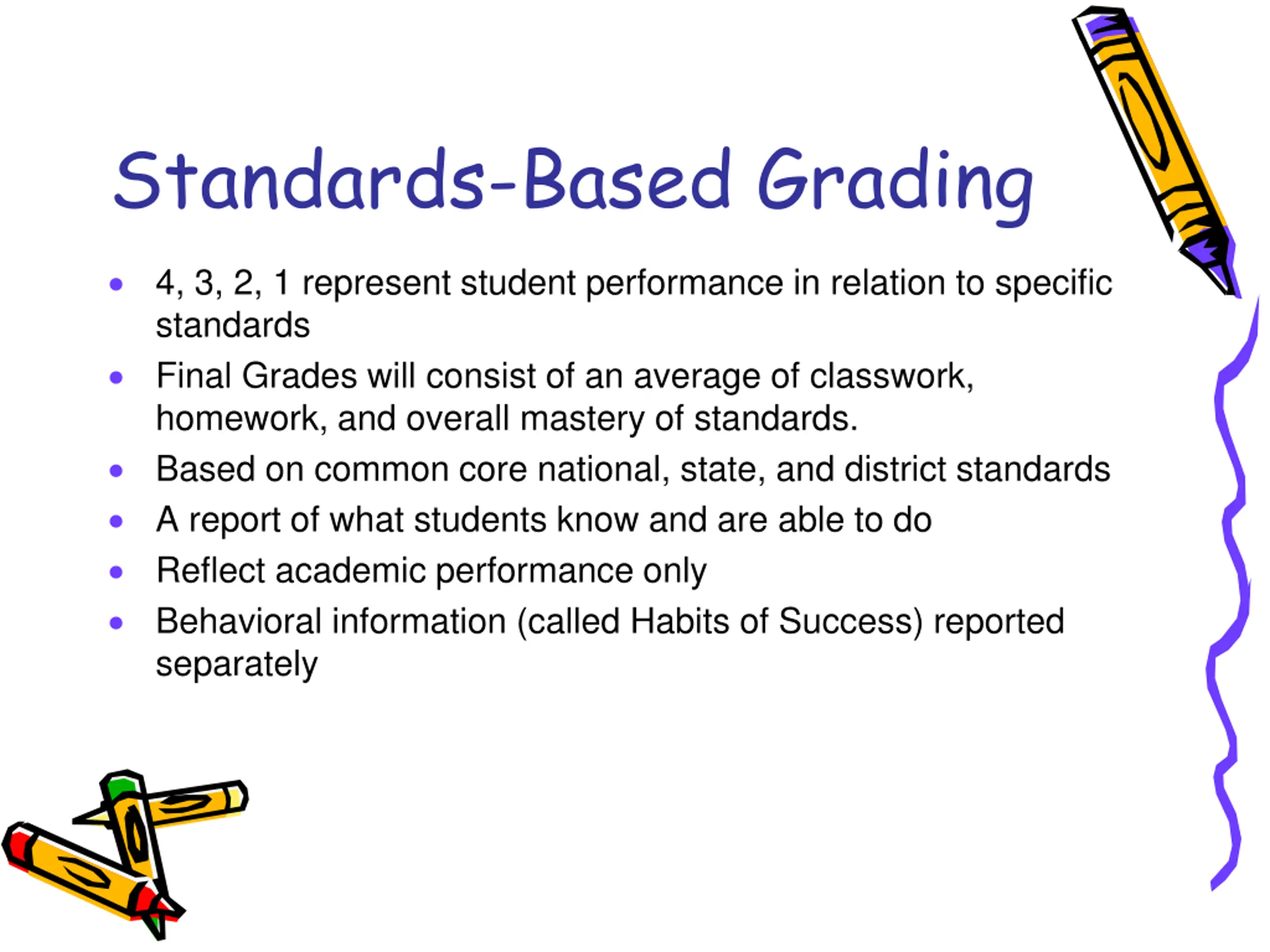 Standards-Based Grading 4, 3, 2, 1 represent student performance in relation to specific standards Final Grades will consist of an average of classwork, homework, and overall mastery of standards. Based on common core national, state, and district standards A report of what students know and are able to do Reflect academic performance only Behavioral information (called Habits of Success) reported separately