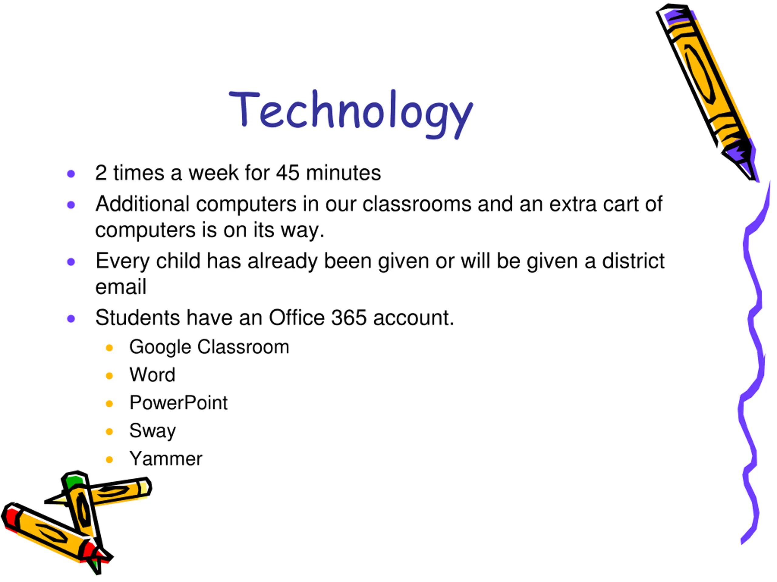 Technology 2 times a week for 45 minutes Additional computers in our classrooms and an extra cart of computers is on its way. Every child has already been given or will be given a district email Students have an Office 365 account. Google Classroom Word PowerPoint Sway Yammer