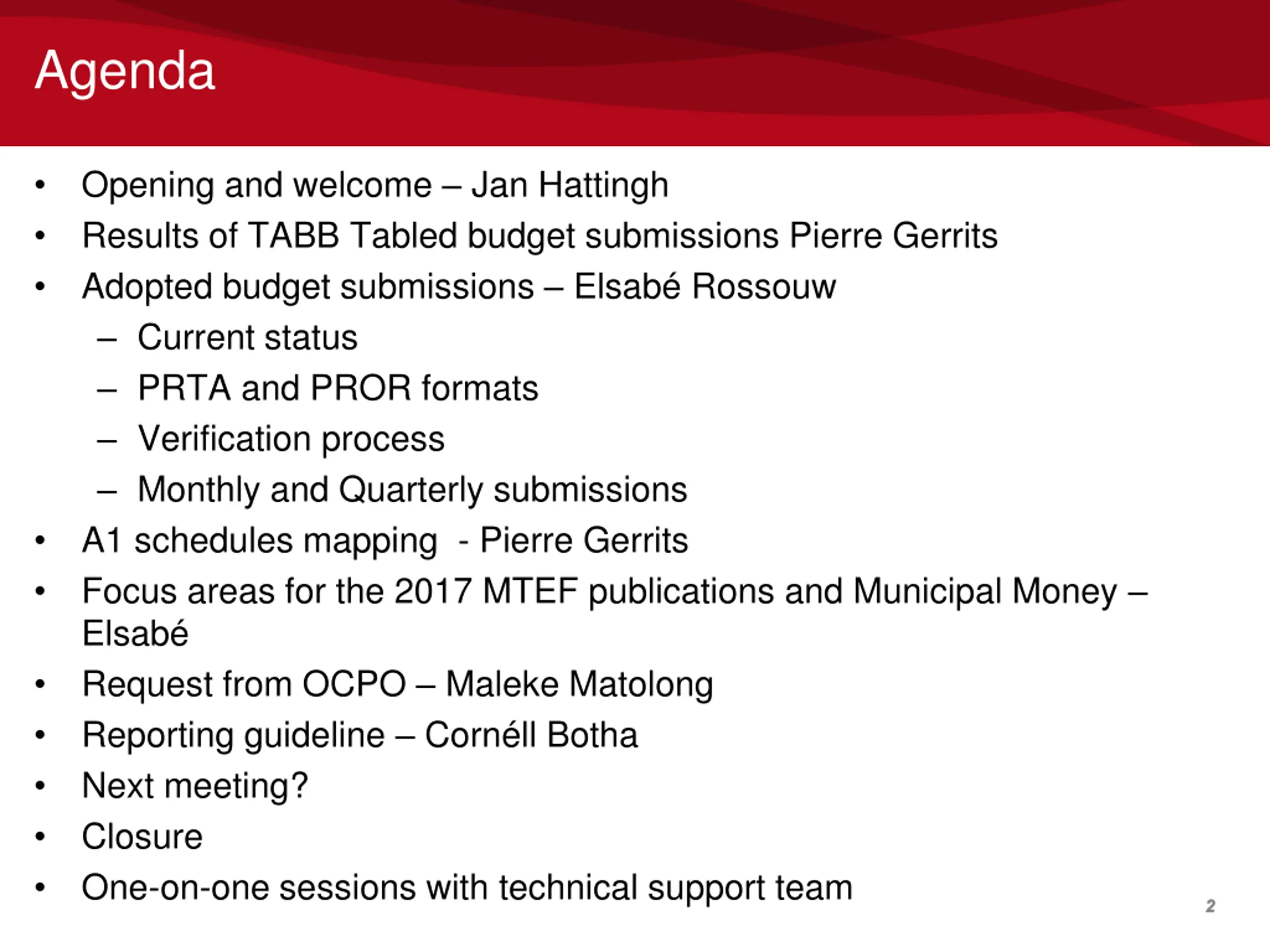 Agenda Opening and welcome Jan Hattingh Results of TABB Tabled budget submissions Pierre Gerrits Adopted budget submissions Elsab Rossouw Current status PRTA and PROR formats Verification process Monthly and Quarterly submissions A1 schedules mapping - Pierre Gerrits Focus areas for the 2017 MTEF publications and Municipal Money Elsab Request from OCPO Maleke Matolong Reporting guideline Corn ll Botha Next meeting? Closure One-on-one sessions with technical support team 2 2
