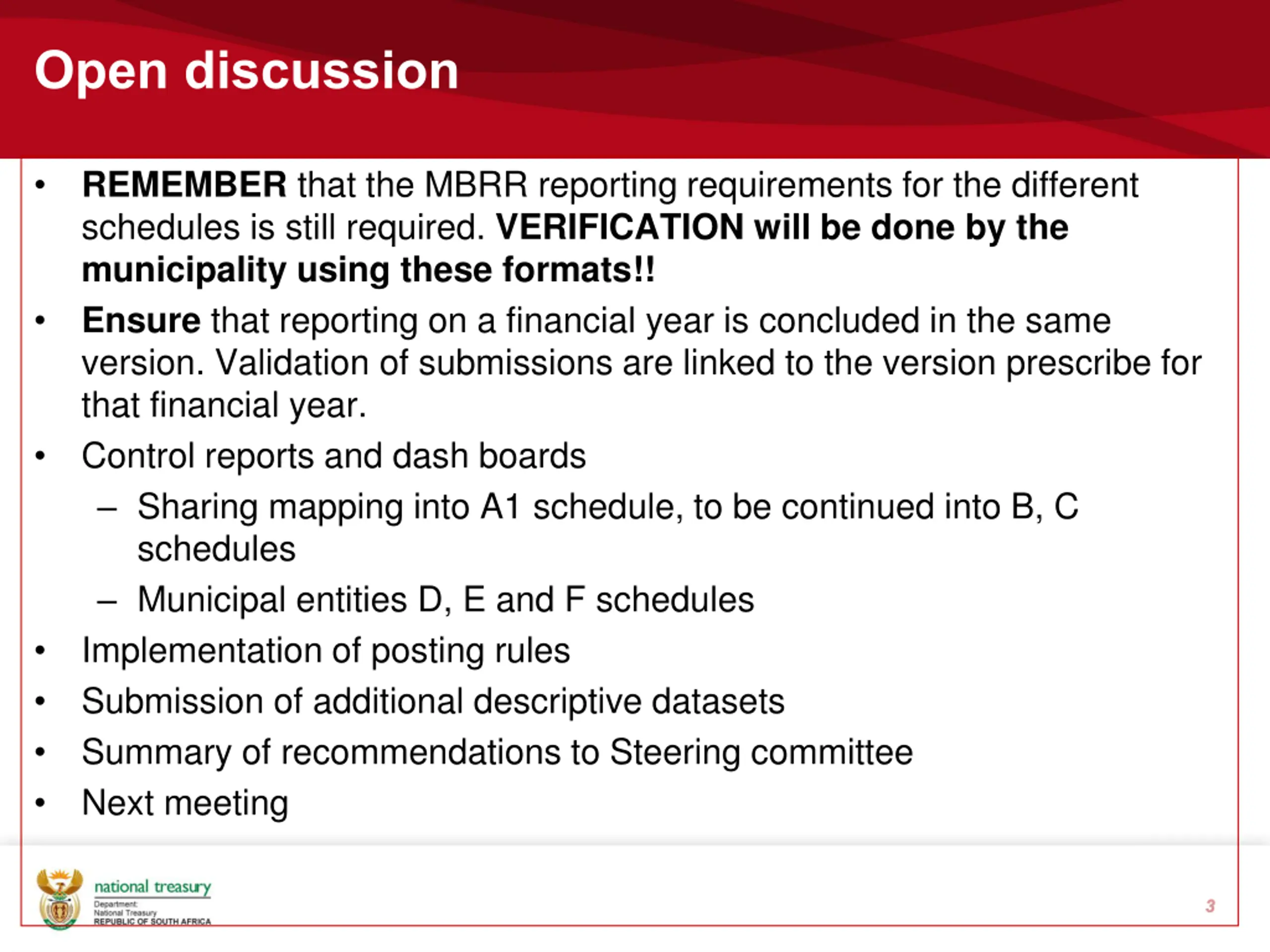 Open discussion REMEMBER that the MBRR reporting requirements for the different schedules is still required. VERIFICATION will be done by the municipality using these formats!! Ensure that reporting on a financial year is concluded in the same version. Validation of submissions are linked to the version prescribe for that financial year. Control reports and dash boards Sharing mapping into A1 schedule, to be continued into B, C schedules Municipal entities D, E and F schedules Implementation of posting rules Submission of additional descriptive datasets Summary of recommendations to Steering committee Next meeting 3 3