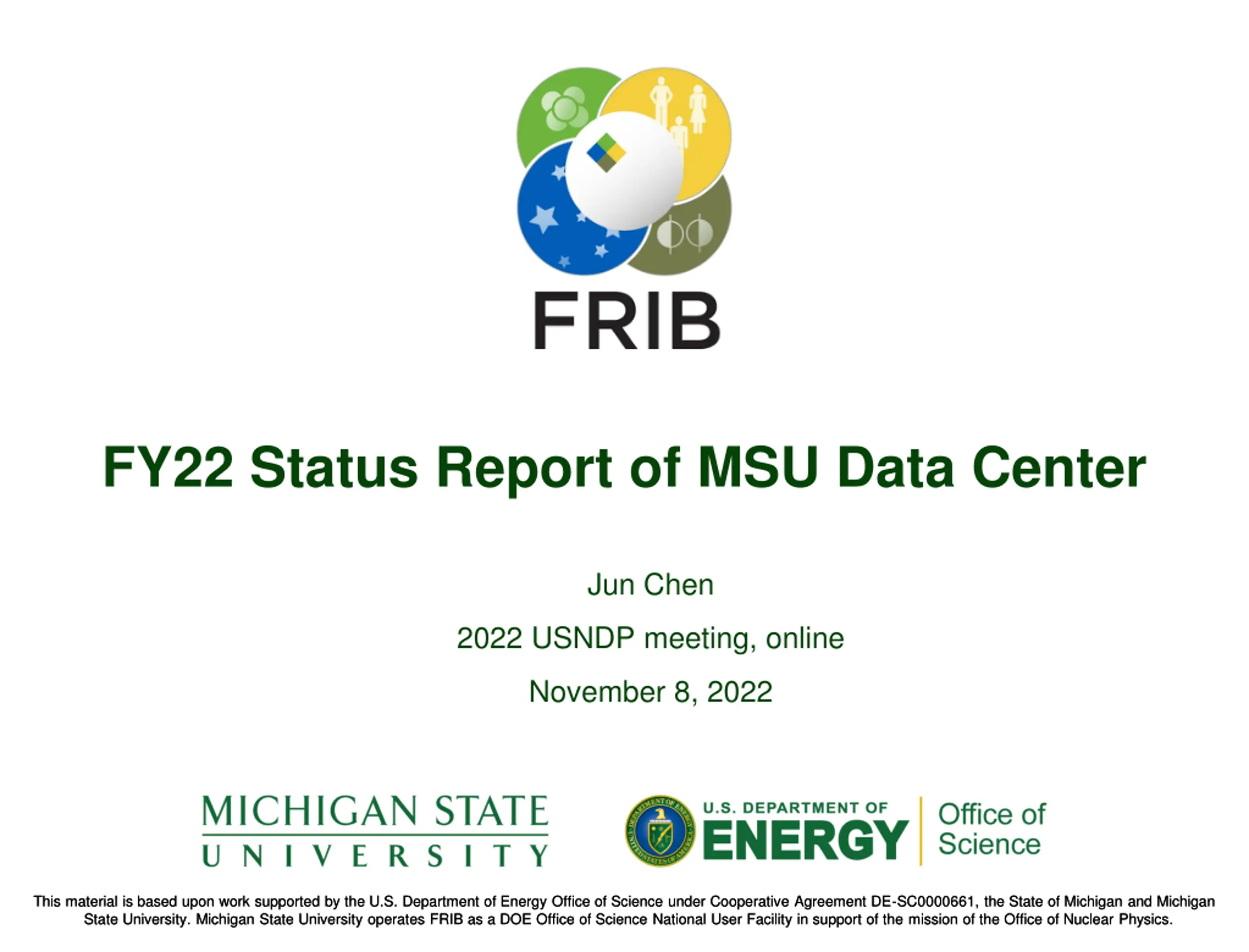 FY22 Status Report of MSU Data Center Jun Chen 2022 USNDP meeting, online November 8, 2022 This material is based upon work supported by the U.S. Department of Energy Office of Science under Cooperative Agreement DE-SC0000661, the State of Michigan and Michigan State University. Michigan State University operates FRIB as a DOE Office of Science National User Facility in support of the mission of the Office of Nuclear Physics. State University. Michigan State University operates FRIB as a DOE Office of Science National User Facility in support of the mission of the Office of Nuclear Physics. This material is based upon work supported by the U.S. Department of Energy Office of Science under Cooperative Agreement DE-SC0000661, the State of Michigan and Michigan