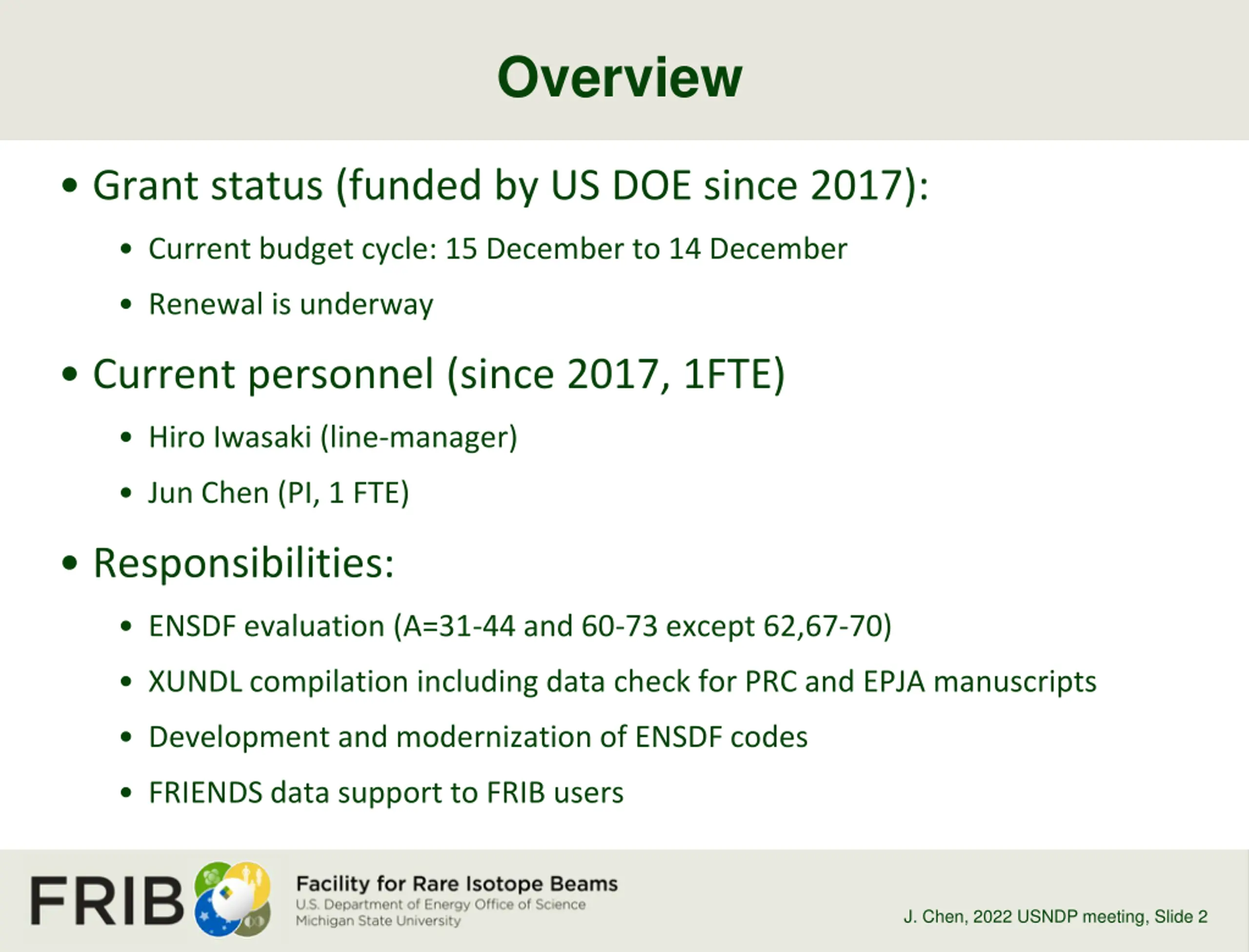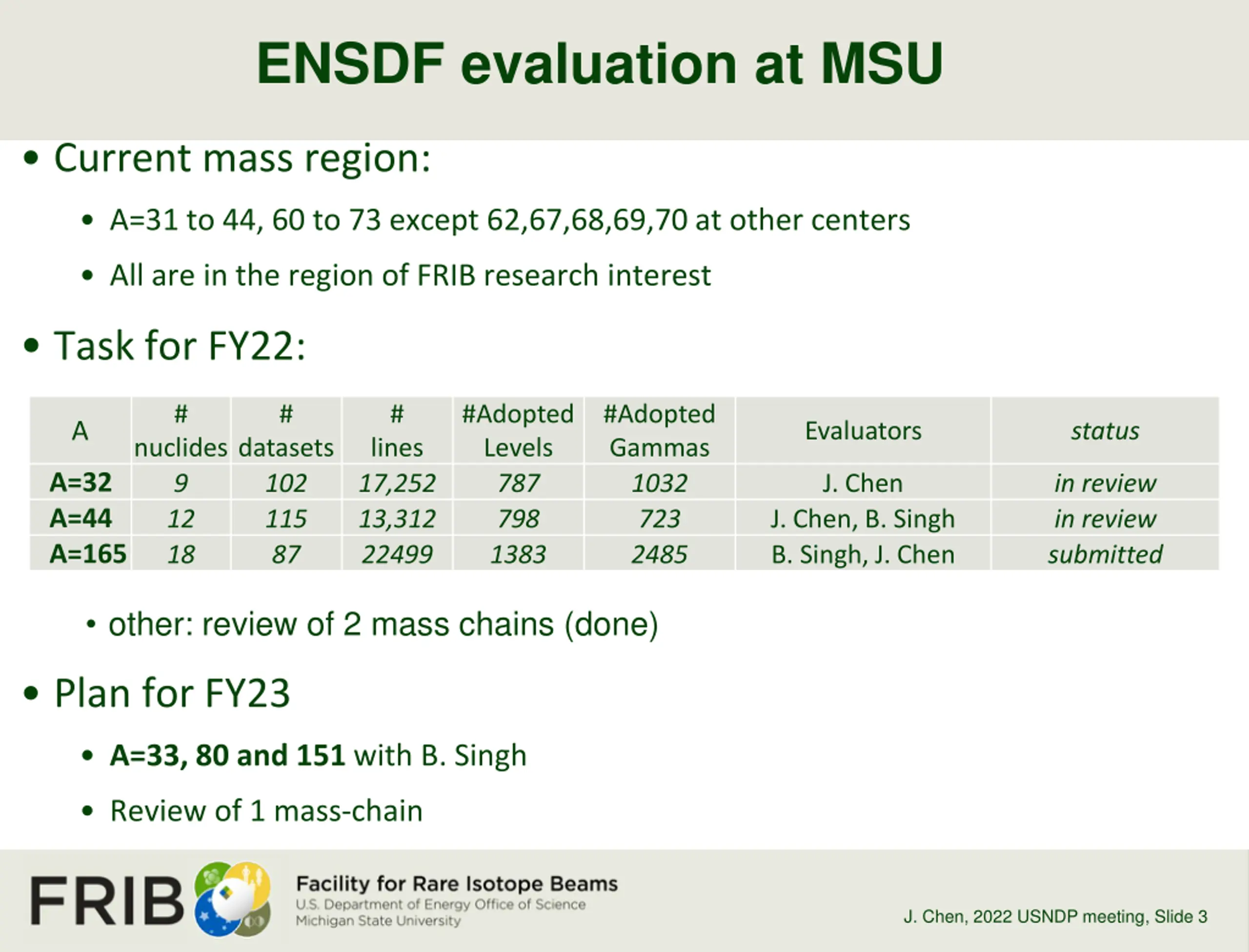 Overview Grant status (funded by US DOE since 2017): Current budget cycle: 15 December to 14 December Renewal is underway Current personnel (since 2017, 1FTE) Hiro Iwasaki (line-manager) Jun Chen (PI, 1 FTE) Responsibilities: ENSDF evaluation (A=31-44 and 60-73 except 62,67-70) XUNDL compilation including data check for PRC and EPJA manuscripts Development and modernization of ENSDF codes FRIENDS data support to FRIB users J. Chen, 2022 USNDP meeting, Slide 2