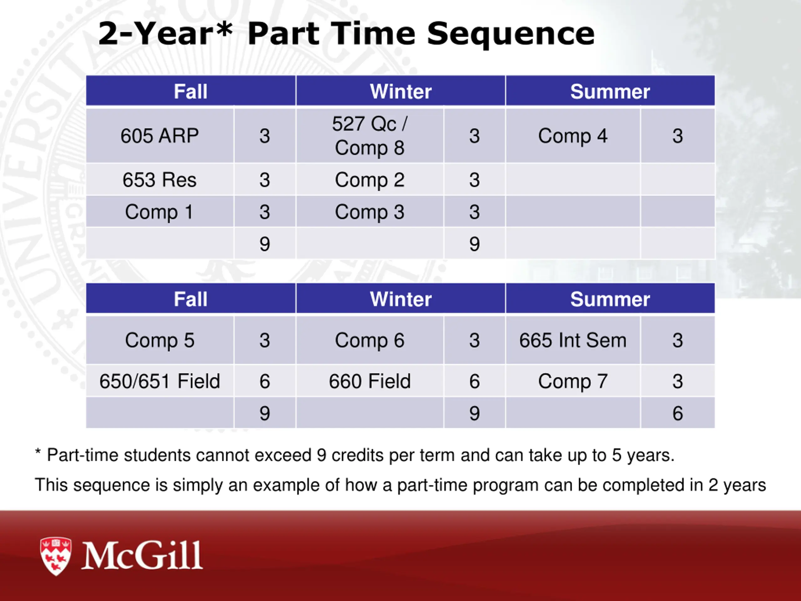 2-Year* Part Time Sequence Fall Winter Summer 527 Qc / Comp 8 Comp 2 Comp 3 605 ARP 3 3 Comp 4 3 653 Res Comp 1 3 3 9 3 3 9 Fall Winter Summer Comp 5 3 Comp 6 3 665 Int Sem 3 650/651 Field 6 9 660 Field 6 9 Comp 7 3 6 * Part-time students cannot exceed 9 credits per term and can take up to 5 years. This sequence is simply an example of how a part-time program can be completed in 2 years