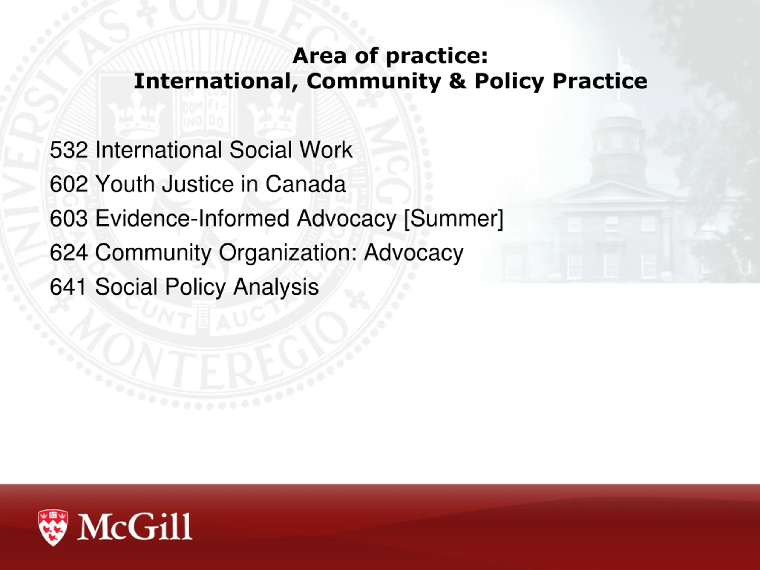 Area of practice: International, Community & Policy Practice 532 International Social Work 602 Youth Justice in Canada 603 Evidence-Informed Advocacy [Summer] 624 Community Organization: Advocacy 641 Social Policy Analysis