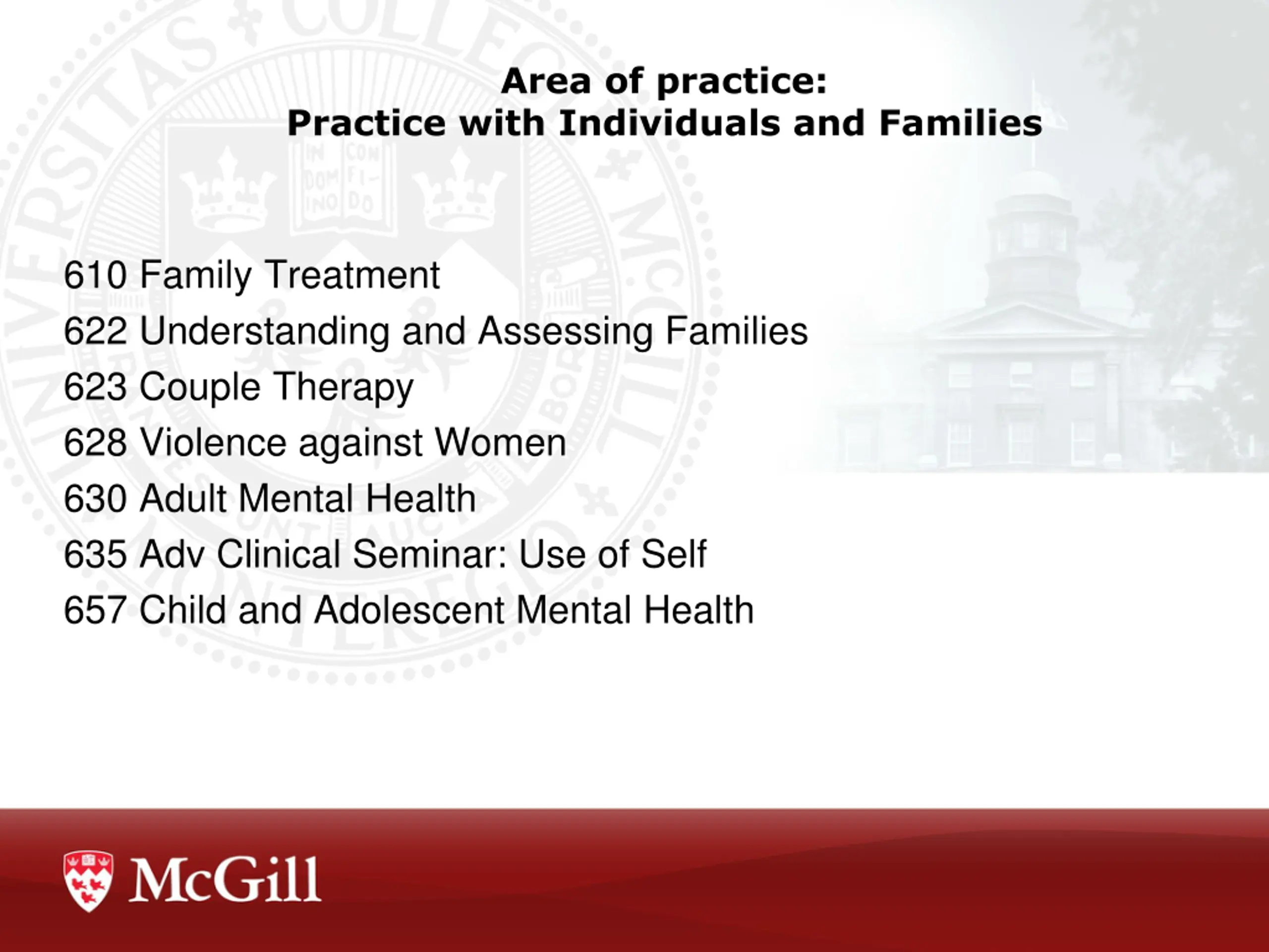 Area of practice: Practice with Individuals and Families 610 Family Treatment 622 Understanding and Assessing Families 623 Couple Therapy 628 Violence against Women 630 Adult Mental Health 635 Adv Clinical Seminar: Use of Self 657 Child and Adolescent Mental Health
