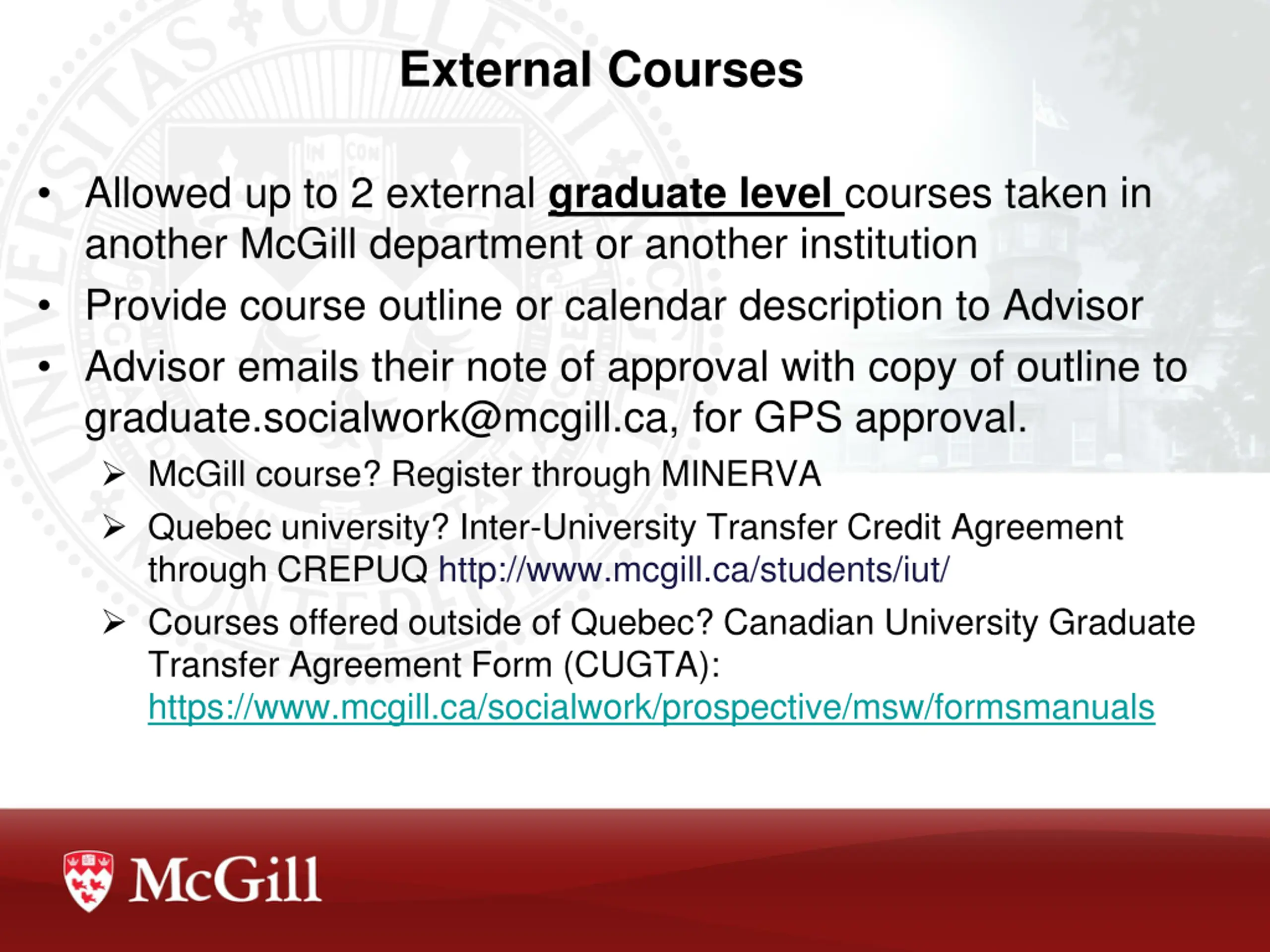 External Courses Allowed up to 2 external graduate level courses taken in another McGill department or another institution Provide course outline or calendar description to Advisor Advisor emails their note of approval with copy of outline to graduate.socialwork@mcgill.ca, for GPS approval. McGill course? Register through MINERVA Quebec university? Inter-University Transfer Credit Agreement through CREPUQ http://www.mcgill.ca/students/iut/ Courses offered outside of Quebec? Canadian University Graduate Transfer Agreement Form (CUGTA): https://www.mcgill.ca/socialwork/prospective/msw/formsmanuals