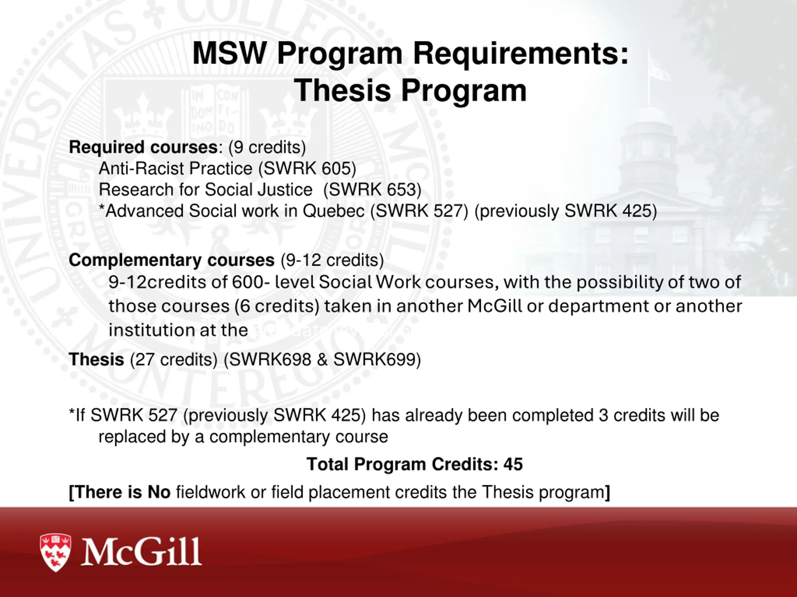 MSW Program Requirements: Thesis Program Required courses: (9 credits) Anti-Racist Practice (SWRK 605) Research for Social Justice (SWRK 653) *Advanced Social work in Quebec (SWRK 527) (previously SWRK 425) Complementary courses (9-12 credits) 9-12credits of 600- level Social Work courses, with the possibility of two of those courses (6 credits) taken in another McGill or department or another institution at the graduate level or 500 level courses with supervpermission Thesis (27 credits) (SWRK698 & SWRK699) *If SWRK 527 (previously SWRK 425) has already been completed 3 credits will be replaced by a complementary course Total Program Credits: 45 [There is No fieldwork or field placement credits the Thesis program]