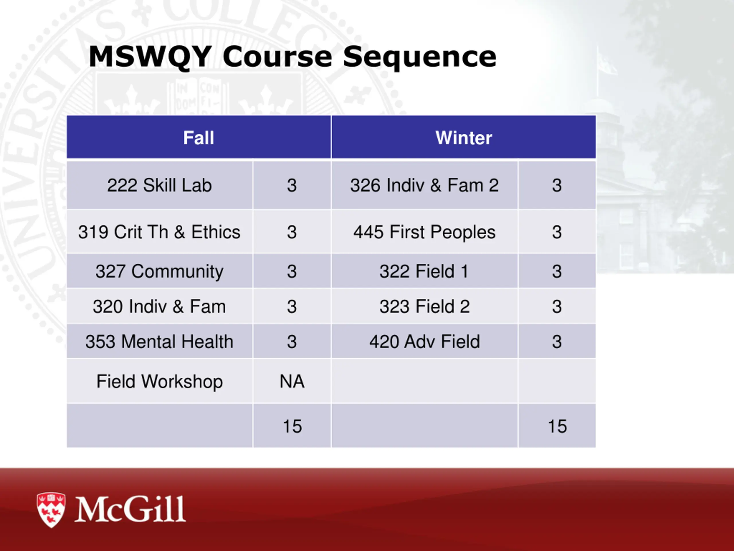 MSWQY Course Sequence Fall Winter 222 Skill Lab 3 326 Indiv & Fam 2 3 319 Crit Th & Ethics 3 445 First Peoples 3 327 Community 3 322 Field 1 3 320 Indiv & Fam 3 323 Field 2 3 353 Mental Health 3 420 Adv Field 3 Field Workshop NA 15 15