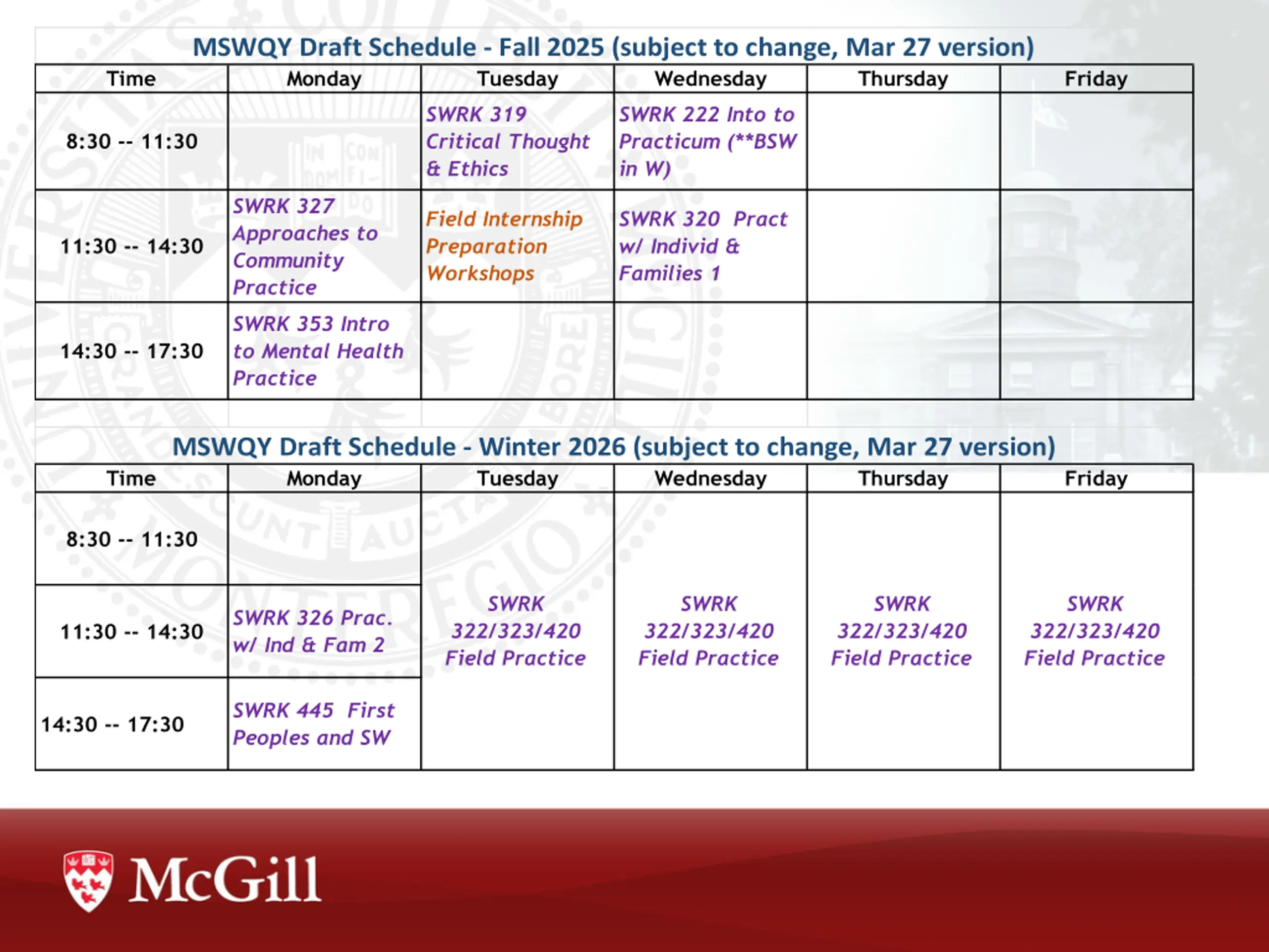 MSWQY Draft Schedule - Fall 2025 (subject to change, Mar 27 version) Time Monday Tuesday Wednesday Thursday Friday SWRK 319 Critical Thought & Ethics SWRK 222 Into to Practicum (**BSW in W) 8:30 -- 11:30 SWRK 327 Approaches to Community Practice Field Internship Preparation Workshops SWRK 320 Pract w/ Individ & Families 1 11:30 -- 14:30 SWRK 353 Intro to Mental Health Practice 14:30 -- 17:30 MSWQY Draft Schedule - Winter 2026 (subject to change, Mar 27 version) Time Monday Tuesday Wednesday Thursday Friday 8:30 -- 11:30 SWRK SWRK SWRK SWRK SWRK 326 Prac. w/ Ind & Fam 2 322/323/420 Field Practice 322/323/420 Field Practice 322/323/420 Field Practice 322/323/420 Field Practice 11:30 -- 14:30 SWRK 445 First Peoples and SW 14:30 -- 17:30