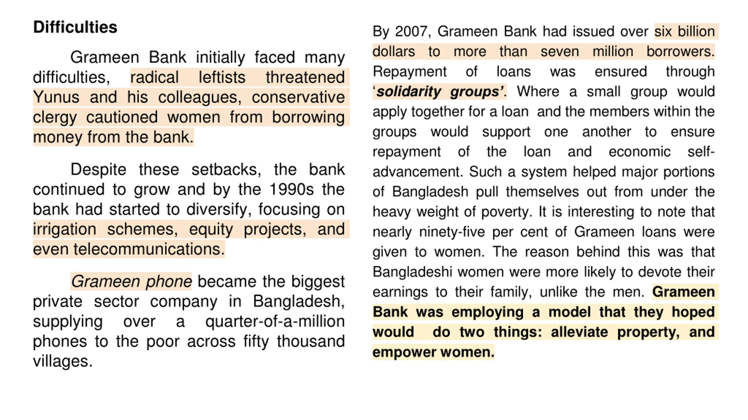 Difficulties By 2007, Grameen Bank had issued over six billion dollars to more than seven million borrowers. Repayment of loans solidarity groups . Where a small group would apply together for a loan and the members within the groups would support repayment of the loan advancement. Such a system helped major portions of Bangladesh pull themselves out from under the heavy weight of poverty. It is interesting to note that nearly ninety-five per cent of Grameen loans were given to women. The reason behind this was that Bangladeshi women were more likely to devote their earnings to their family, unlike the men. Grameen Bank was employing a model that they hoped would do two things: alleviate property, and empower women. Grameen Bank initially faced many difficulties, radical Yunus and his colleagues, conservative clergy cautioned women from borrowing money from the bank. was ensured through leftists threatened one another and to ensure self- economic Despite these setbacks, the bank continued to grow and by the 1990s the bank had started to diversify, focusing on irrigation schemes, equity projects, and even telecommunications. Grameen phone became the biggest private sector company in Bangladesh, supplying over a phones to the poor across fifty thousand villages. quarter-of-a-million
